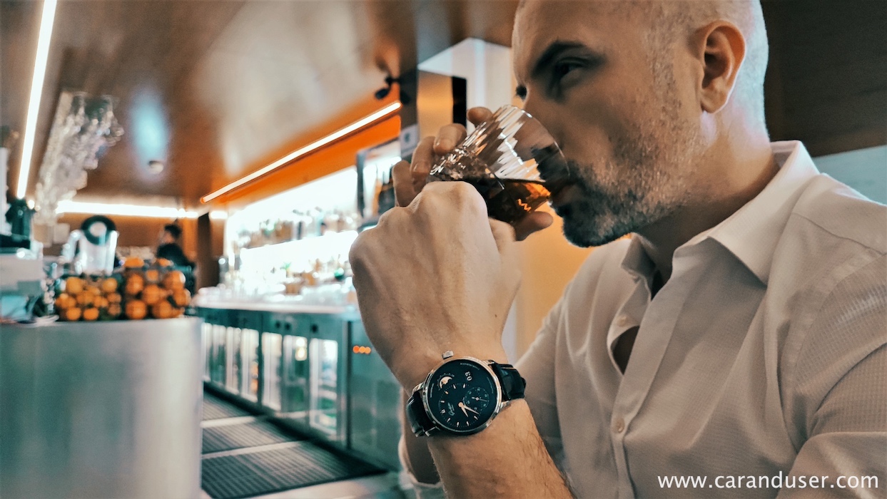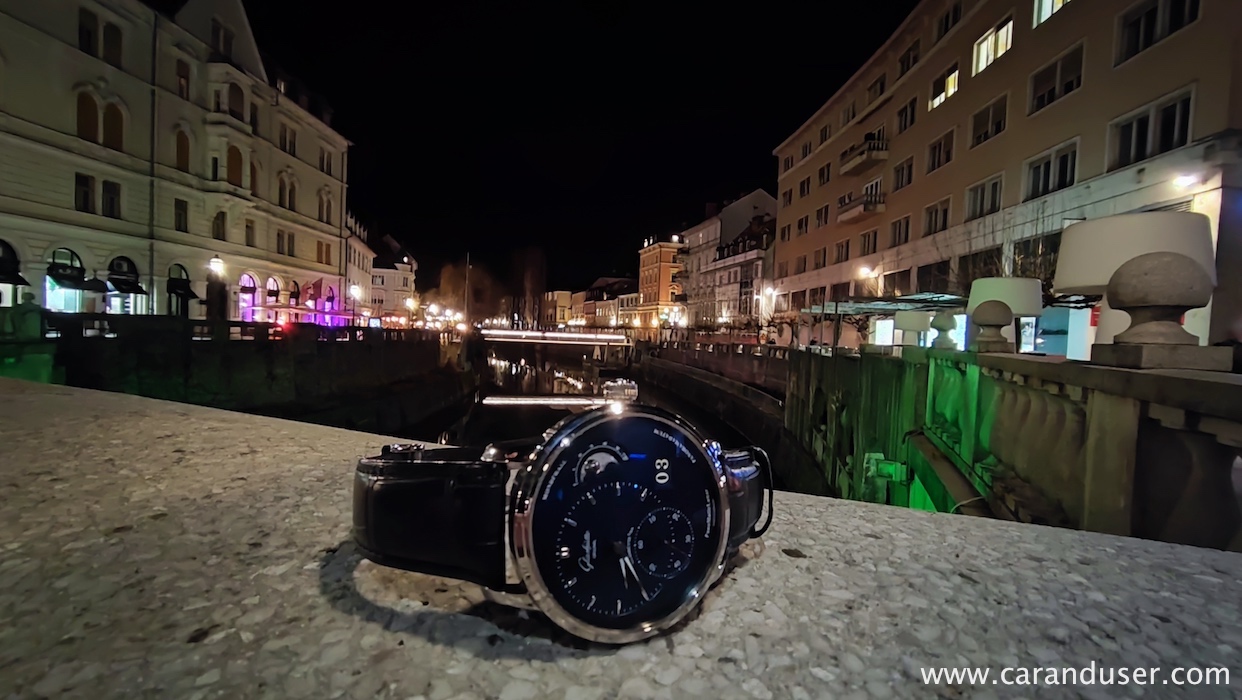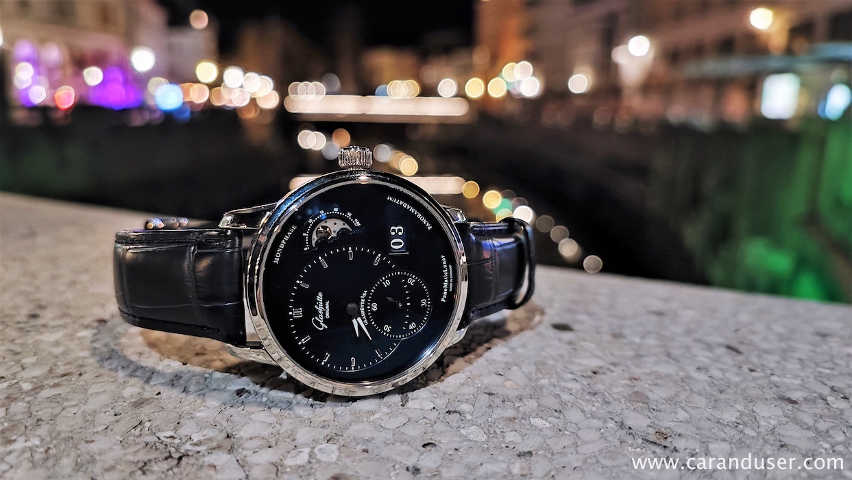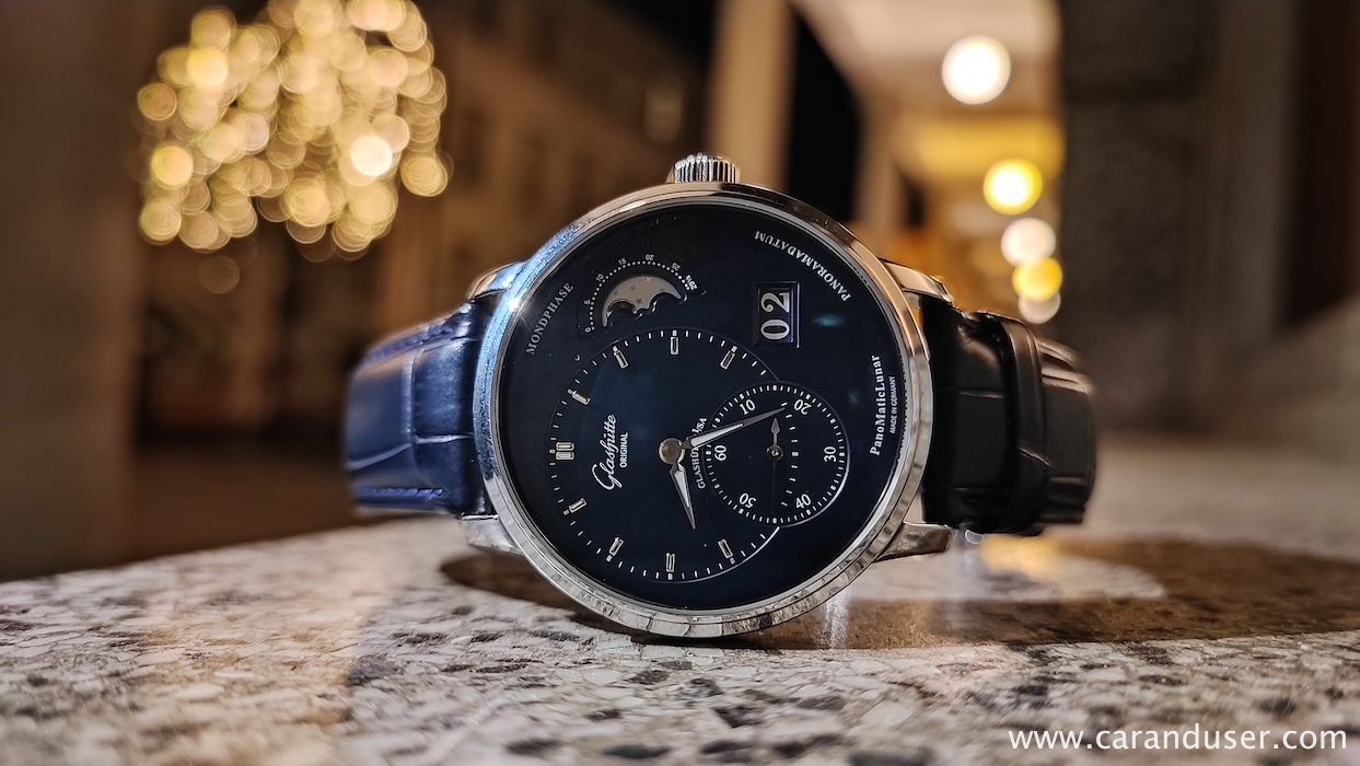 Le zakaj je ne bi, si mislim pri sebi. Veličastna ura s posebno številčnico. Razgled na čudovit mehanizem. Časomer, ki ga lahko v nedogled občuduješ, kar sem med preizkušanjem zaznal na enem izmed sestankov v podjetju, kjer je sodelavec ”buljil” na moje zapestje. Želel sem se prepričati, če res gleda uro ali je samo zamišljen, zato sem hipoma čez Panomatic Lunarja potegnil rokav in njegov pogled je spremenil smer. Res je, tako vpadljiva je ta ura, sploh, če še nanjo posije sonce, žarki katerega razkrijejo prelivajočo se barvo številčnice ter bleščeče zvezde na disku prikaza luninih men.
