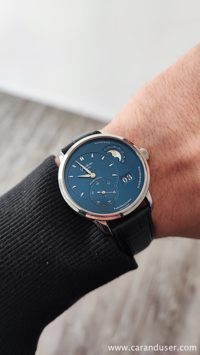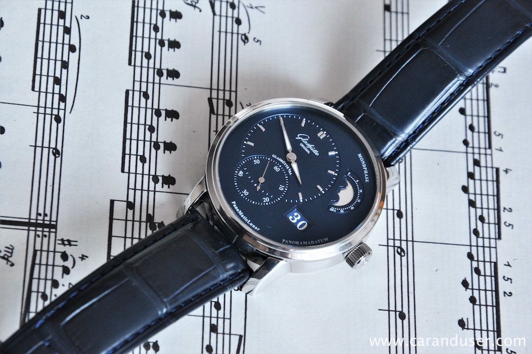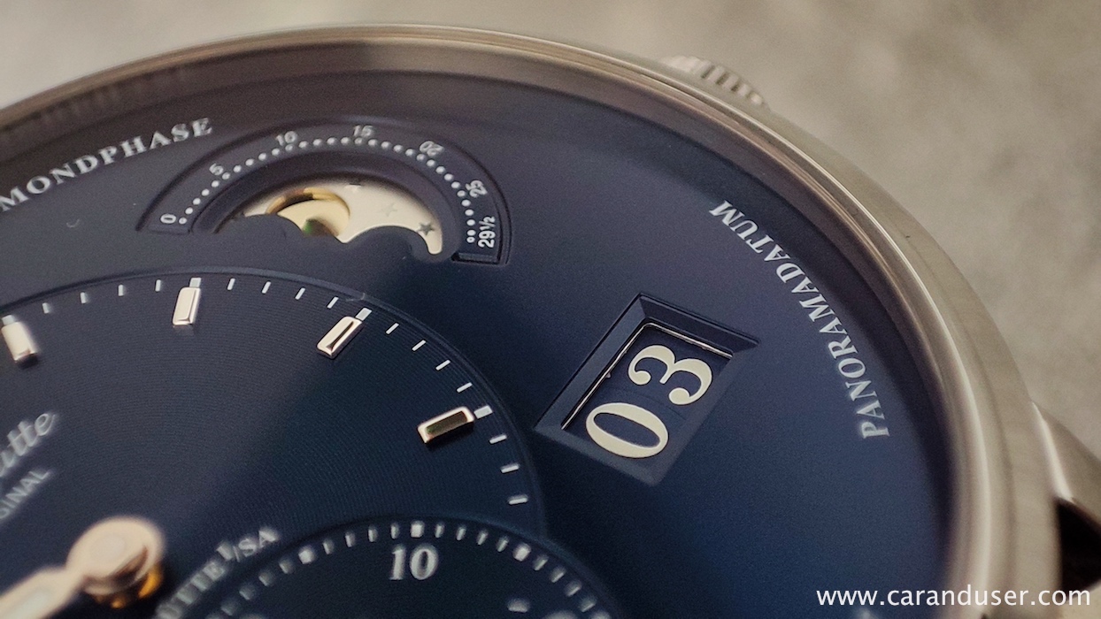 Oblika torej spomina na vintage žepno ura, vendar na tem mestu se podobnost konča. Številčnica pompozno nastopa s svojo asimetrično postavitvijo, katera je nemško natančno preračunana z razdaljami med elementi. Koncept verjetno poznate s sosednje vaške manufakture, ampak dvomim, da v tem primeru govorimo o konkurenčnosti. Vsaka številčnica ima svojevrsten šarm in PanoMatic Lunar s temno modro galvanizirano številčnico preverjeno nikogar ne bo pustil ravnodušnega. Podlaga prikaza časa in sekund ima teksturo gramofonske plošče in prelivajočo se barvo z učinkom sončnih žarkov. Luminiscenca se nahaja le v kazalcema ur in minut, kar je dovolj, saj takšne ure praviloma redkeje nadenemo ter so bolj namenjene občudovanju kot branju natančnega časa. Skratka, na mestu 4. ure klasične številčnice se nahaja hišni patent prikaza datuma PanoramaDate, ki deluje s pomočjo dveh diskov. Prvi ali levi nosi številke od 0 do 3, medtem ko desni prikazuje cifre od 1 do 9.