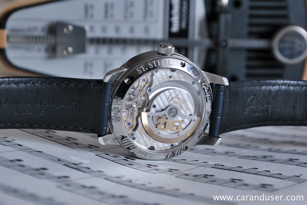 Tega najdemo tudi na hrbtni strani in nam razkriva še bolj osupljivo ročno delo. Če še nemara ne veste, je Glashütte Original eden redkih proizvajalcev ur, ki v lastni ”tovarni” ustvarja imenitne številčnice. Tem se pridružujejo še dovršeni mehanizmi, zato bi bil greh, če bi jih zaprli s kakšnim kovinskim pokrovom.