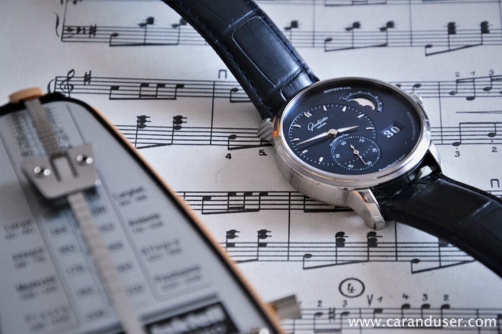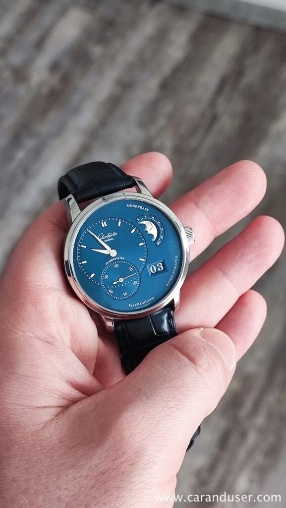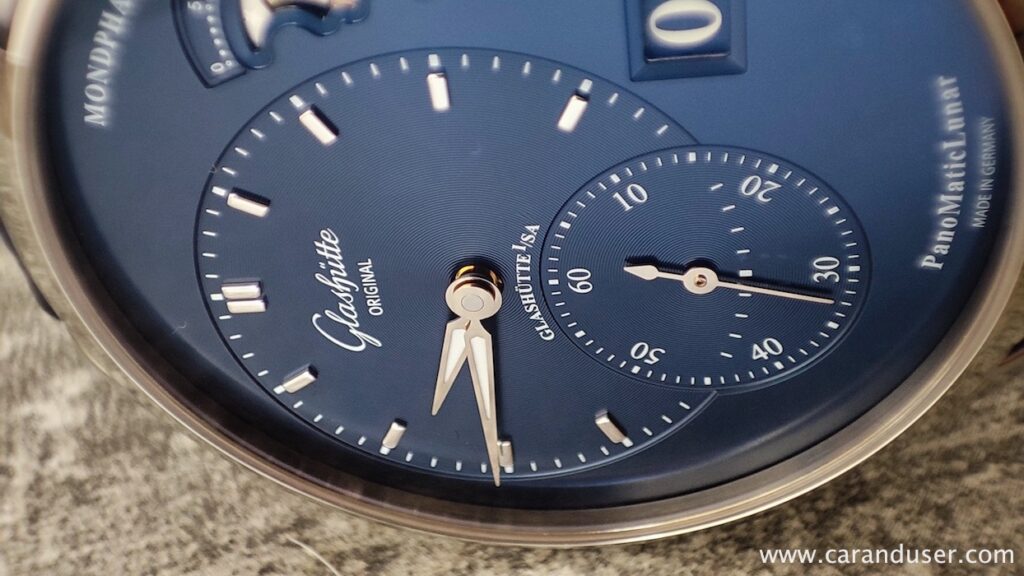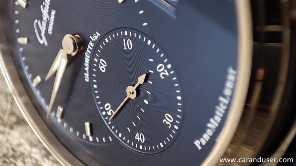 Oblika torej spomina na vintage žepno ura, vendar na tem mestu se podobnost konča. Številčnica pompozno nastopa s svojo asimetrično postavitvijo, katera je nemško natančno preračunana z razdaljami med elementi. Koncept verjetno poznate s sosednje vaške manufakture, ampak dvomim, da v tem primeru govorimo o konkurenčnosti. Vsaka številčnica ima svojevrsten šarm in PanoMatic Lunar s temno modro galvanizirano številčnico preverjeno nikogar ne bo pustil ravnodušnega. Podlaga prikaza časa in sekund ima teksturo gramofonske plošče in prelivajočo se barvo z učinkom sončnih žarkov. Luminiscenca se nahaja le v kazalcema ur in minut, kar je dovolj, saj takšne ure praviloma redkeje nadenemo ter so bolj namenjene občudovanju kot branju natančnega časa. Skratka, na mestu 4. ure klasične številčnice se nahaja hišni patent prikaza datuma PanoramaDate, ki deluje s pomočjo dveh diskov. Prvi ali levi nosi številke od 0 do 3, medtem ko desni prikazuje cifre od 1 do 9.