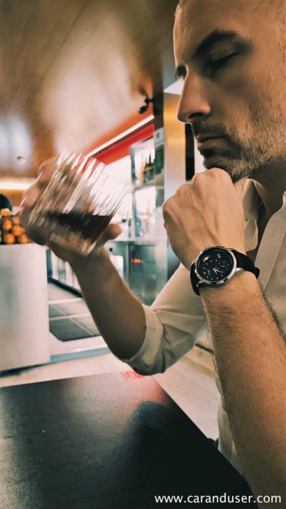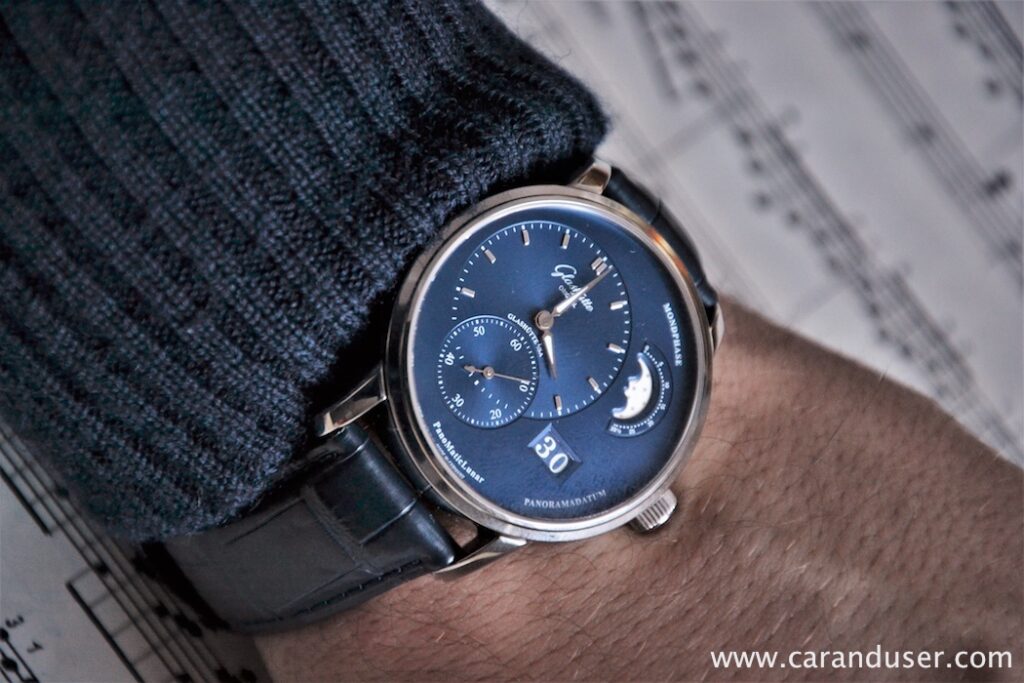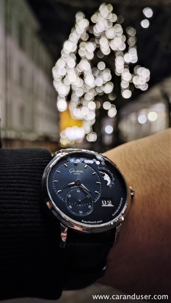 Le zakaj je ne bi, si mislim pri sebi. Veličastna ura s posebno številčnico. Razgled na čudovit mehanizem. Časomer, ki ga lahko v nedogled občuduješ, kar sem med preizkušanjem zaznal na enem izmed sestankov v podjetju, kjer je sodelavec ”buljil” na moje zapestje. Želel sem se prepričati, če res gleda uro ali je samo zamišljen, zato sem hipoma čez Panomatic Lunarja potegnil rokav in njegov pogled je spremenil smer. Res je, tako vpadljiva je ta ura, sploh, če še nanjo posije sonce, žarki katerega razkrijejo prelivajočo se barvo številčnice ter bleščeče zvezde na disku prikaza luninih men.