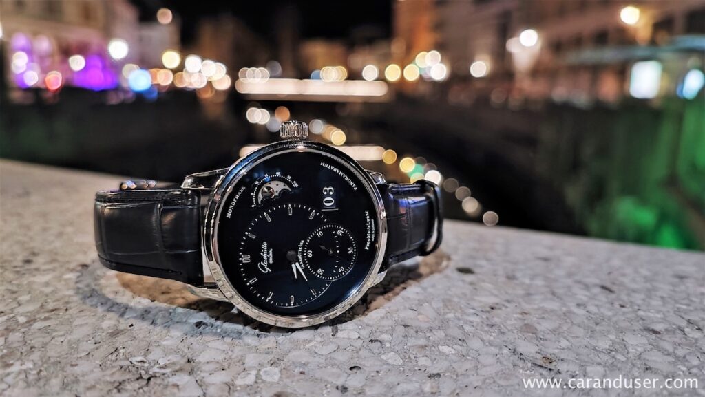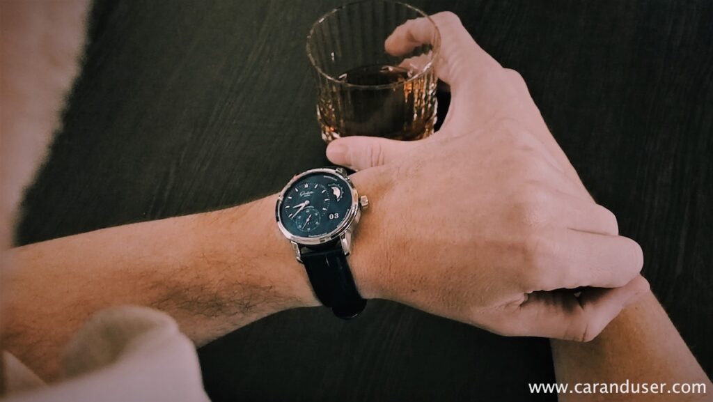 Med pogovorom urarske tematike sem pomislil na nedavno preizkušeno, idealno za njegovo zapestje. Petična, skrbno izdelana, mehansko popolna in elegantnega videza, ki nalašč ustreza življenjskemu stilu ljubitelja romantike mehanskih ur. Izvlečem telefon in pokažem fotografijo testne ure Glashütte Original PanomaticLunar. ”Poezija”, doda in nadaljuje: ”Poznam to nemško blagovno znamko. Vrhunske ure izdeluje. Škoda, da se vedno pri nakupu odločimo za klišeje. Mogoče jo kdaj postavim v svojo vitrino.”