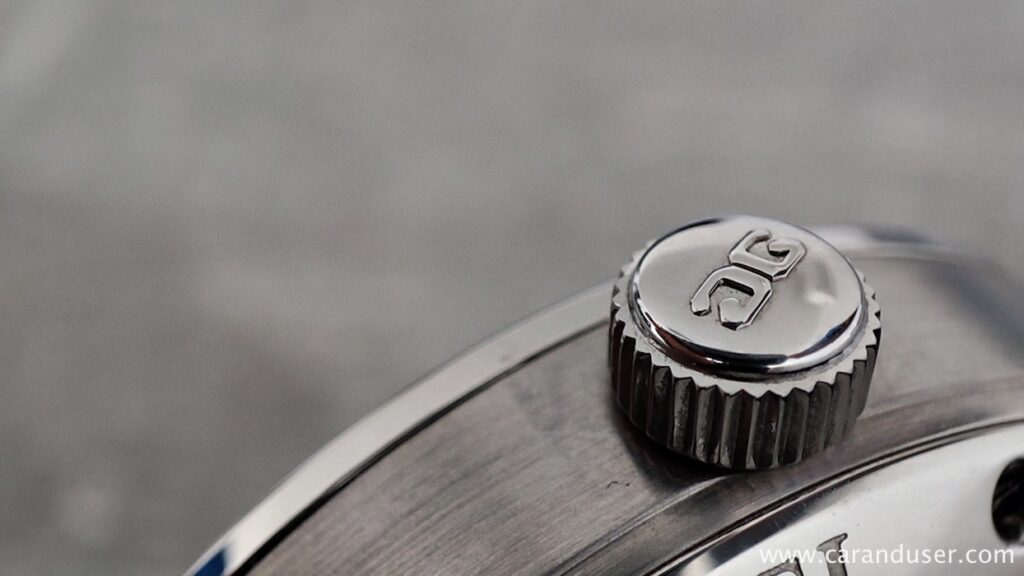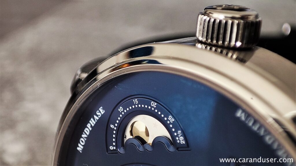 Ne toliko uporaben kot všečen pa je zaplet prikaza luninih men. Ta se nahaja v območju 2. ure, nastavlja pa se ga s pomočjo vzmetnega gumba na boku ročno brušenega ohišja. Malo nižje na desni strani ohišja se nahaja še nastavitvena krona, s katero v prvi poziciji navijamo mehanizem, v drugi nastavimo datum ter zadnji korigiramo čas. Izgled vrhnje strani časomera zaključuje safirni kristal.