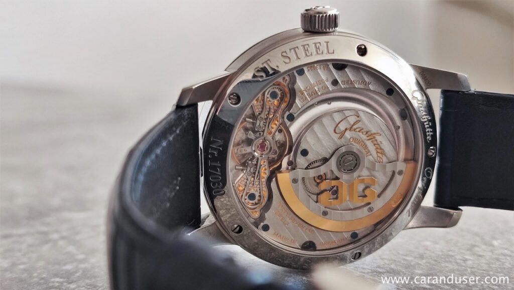 Tega najdemo tudi na hrbtni strani in nam razkriva še bolj osupljivo ročno delo. Če še nemara ne veste, je Glashütte Original eden redkih proizvajalcev ur, ki v lastni ”tovarni” ustvarja imenitne številčnice. Tem se pridružujejo še dovršeni mehanizmi, zato bi bil greh, če bi jih zaprli s kakšnim kovinskim pokrovom.
