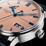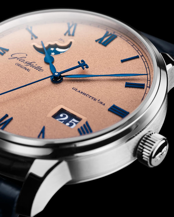 Panoramski datum s podpisom Glashütte Original ob 4. uri zagotavlja izjemno čitljivost že na prvi pogled, saj z dvema koncentričnim datumskim diskom prikazuje bele številke na mat modri podlagi. Za razliko od običajnih modelov so številke prikazane brez osrednje navpične črte, saj sta diska nameščena na isti ravni.
