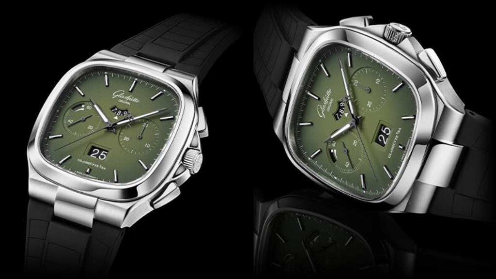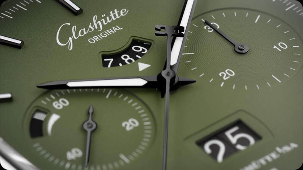 Zasnova zapestne ure ostaja složna kolekciji ”Seventies”. Kovinsko ohišje z zaobljenimi vogali meri 40 mm x 40 mm. Na zeleni številčnici z učinkom sončnih žarkov, se podpis manufakture Glashütte Original Panorama Date nahaja tako ob 6. uri, kjer je mesto za prikazu datuma, in 12-uri, pod katero se nahaja števec z 12-urnim prikazom kronografa (merjenega časa). Oba števca sta barvno usklajena in imata bele številke, postavljene na zeleno podlago.