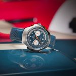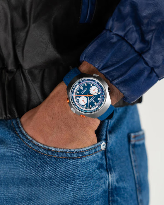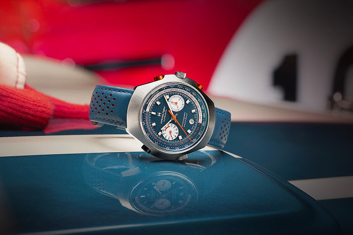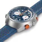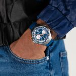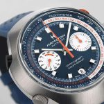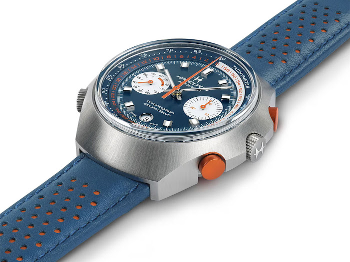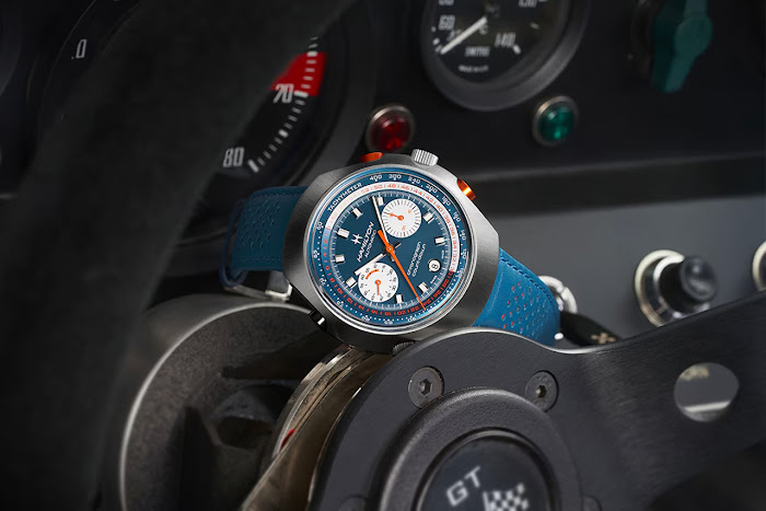 Predstavljena kreacija Hamilton American Classic Chrono-Matic 50 Auto Chrono, v kombianciji z modrim perforiranim usnjenim paščkom in zaponko iz nerjavečega jekla, bo kmalu na voljo za ogled in nakup v najbližjem butiku Slowach po priporočeni prodajni ceni 2.620 evrov.
