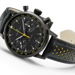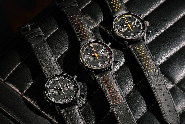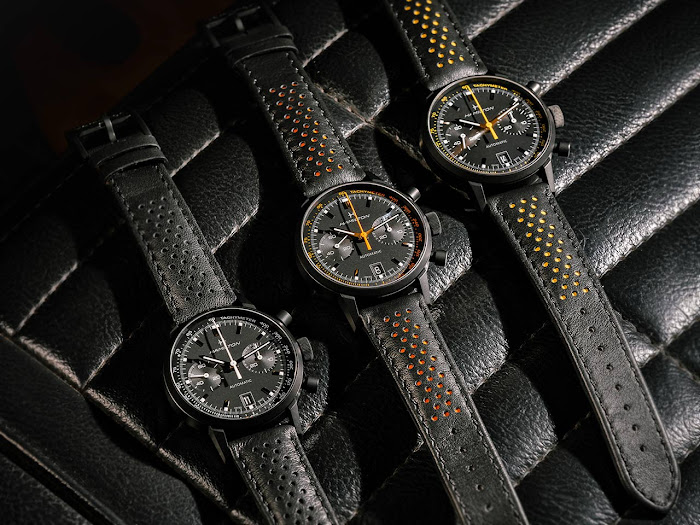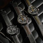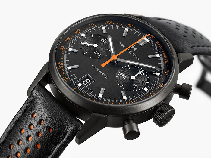 Prva možnost ponuja minimalističen, eleganten videz z utišano črno številčnico ter kontrastnimi belimi indeksi in kazalci (ref. št. H38446732). Za tiste, ki iščejo barvno popestritev, sta v drugih dveh različicah dodani rumena (ref. št. H38446731) ali oranžna (ref. št. H38446732) barva na ročici kronografa, tahimetrski skali ter perforacijah na usnjenem paščku.