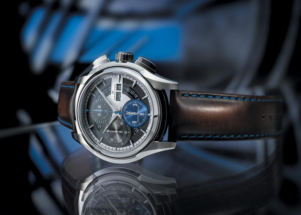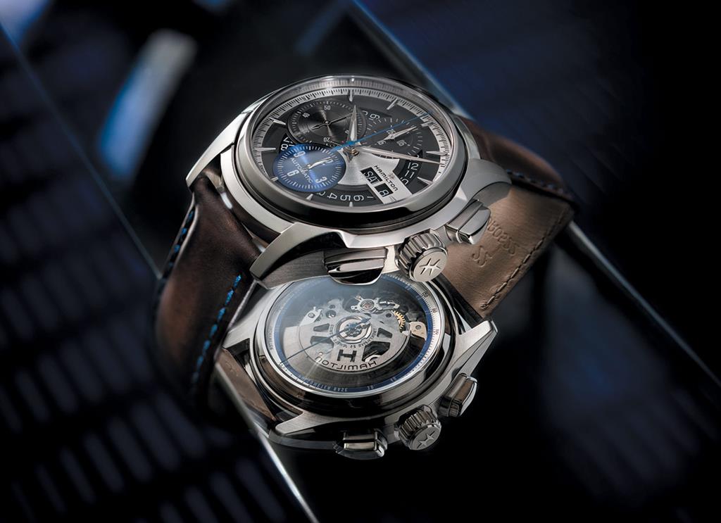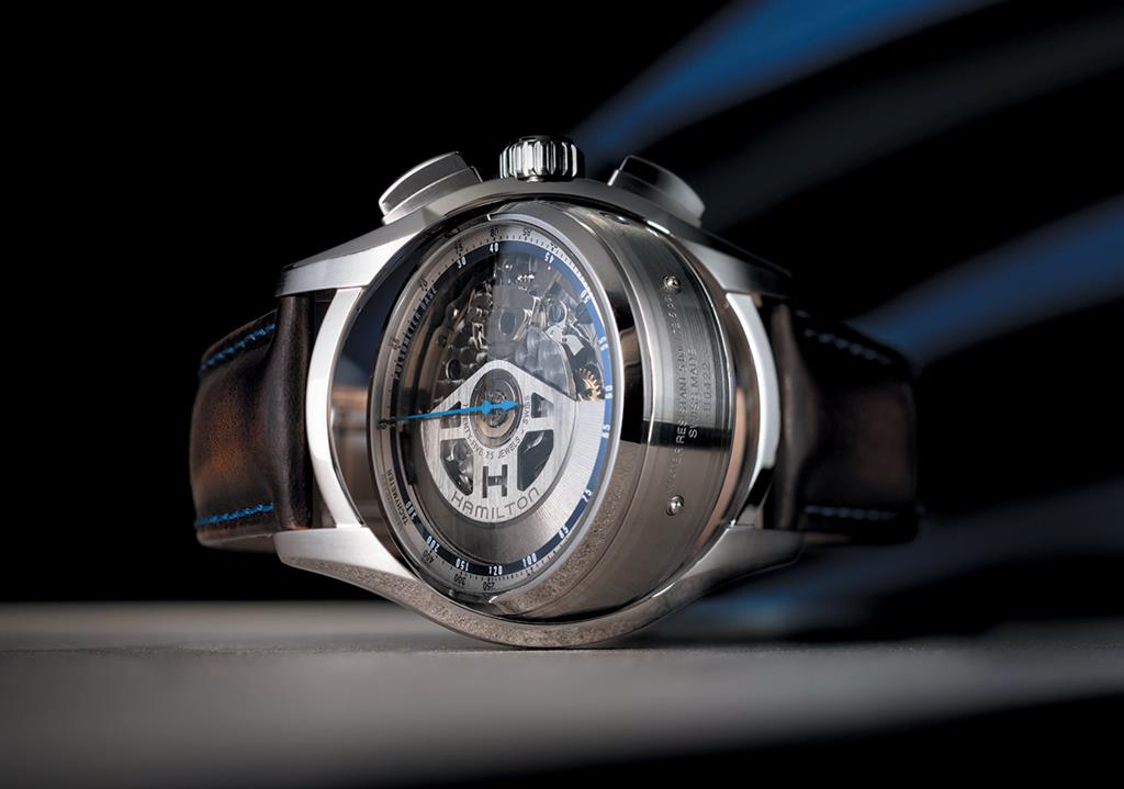 Če časomer gledate od zgoraj, ne opazite nič sumljivega, kar bi izdalo njegovo posebnost. Jazzmaster Face 2 Face z urnim in minutnim kazalcem prikazuje čas preko indeksov, nameščenih ob robu skeletne številčnice medtem ko trije števci kronografa ob 12., 9. in 6. uri beležijo pretekle ure, minute in sekunde. Te prekrivajoče se podštevilčnice so nameščene nad datumsko kolesce in tvorijo tridimenzionalno strukturo.