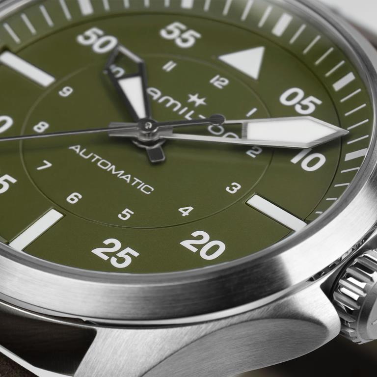 Nove ure Khaki Aviation Pilot 39 mm poganja avtomatski mehanizem H-10 s 25 dragulji in vzmetjo Nivachron. Ta mehanizem temelji na arhitekturi ETA, znani tudi pod imenom Powermatic 80, ponuja impresivno 80-urno rezervo energije navtija, kar ga razlikuje od klasičnega mehanizma ETA 2824. Mehanizem je viden skozi hrbtno stran ohišja iz safirnega stekla, ki prikazuje Hamiltonov značilni logotip v obliki črke H ter izrezano obliko rotorja.