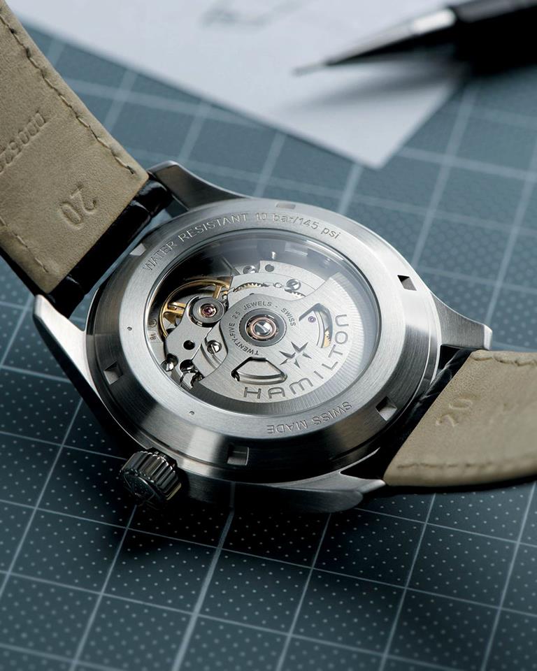Skozi razstavno hrbtno stran ohišja je mogoče videti delovanje avtomatskega mehanizma, kaliber H-10, z 80-urno rezervo energije navitja. Hamilton Khaki Field Murph 38 mm je na voljo na črnem usnjenem paščku po priporočeni prodajni ceni 870 evrov. Več informacij o modelu in nakupu lahko dobite pri zastopniku Slowatch.