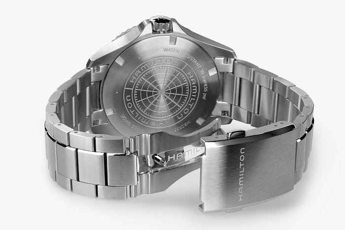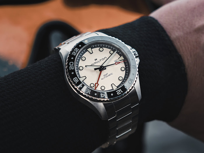 Hamilton Khaki Navy Scuba GMT ohranja značilno mornarsko estetiko, z merami 43 mm × 13,9 mm, opremljen z navojno krono, ki omogoča vodotesnost do 30 barov (300 metrov). Ena različica ponaša z ohišjem iz nerjavečega jekla s krtačeno zapestnico in zrnato belo številčnico, ki jo krasi svetlo zelena Super-LumiNova za boljšo čitljivost.