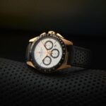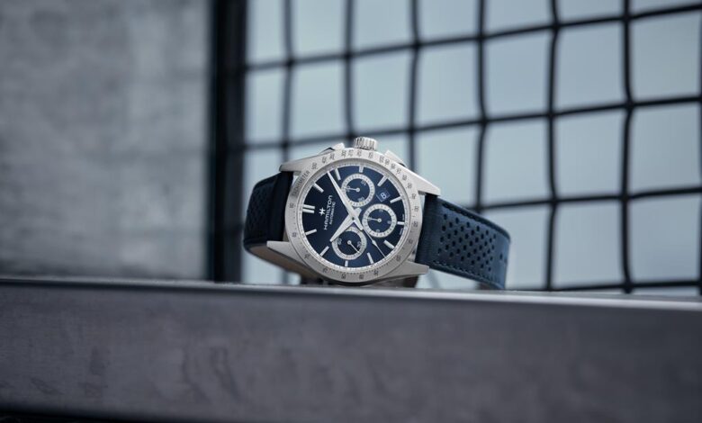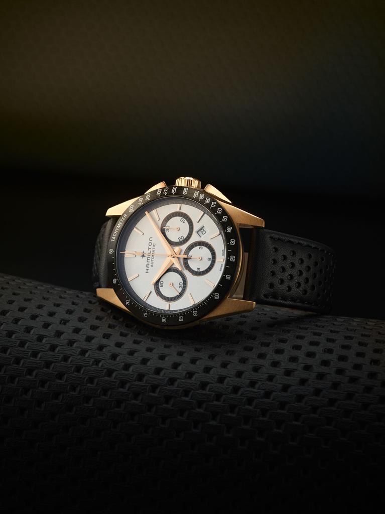 Še cene. Hamilton Jazzmaster Performer Automatic Chronograph 42mm se v kombinaciji z usnjenim paščkom ceni na 2.395 evrov in 2.475 evrov ob izbiri jeklene zapestnice. Cena rožnaetga PVD modela pa znaša 2.545 evrov.