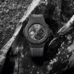 Zvesta estetiki All Black, je zapestna ura oblečena izključno v črno-sive tone – indeksi z antracitnim nanosom, kazalci z vtisnjenim črnim svetlečim materialom in črn gumijast pas s sivimi vstavki iz telečjega usnja ter raztegljivo zaponko.
