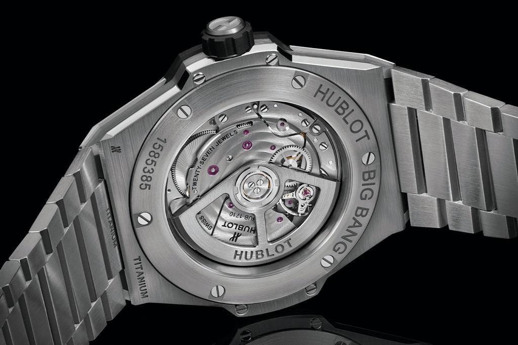 Nova ura Big Bang Integral Time Only na številčnici, ki poleg časa prikazuje tudi datum (očitno ni ”samo čas” 😊), ponuja odprt pogled na kaliber v sredici ohišja. Ni ravno umetniški presežek, vendar je v primerjavi z ostalimi modeli linije sorazmerno umirjenega videza. Mehanizem je tipa MHUB1710, kar pomeni, da gre za avtomatsko navijalni kaliber s 50-urno rezervo moči.