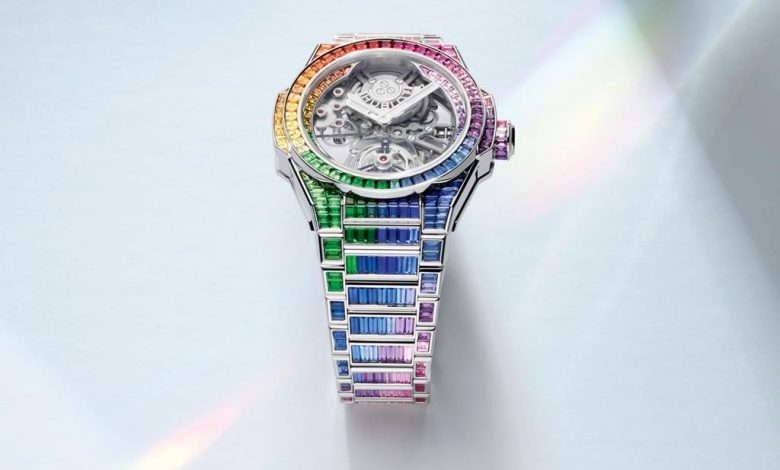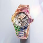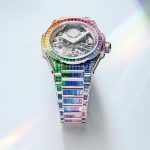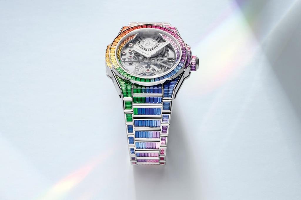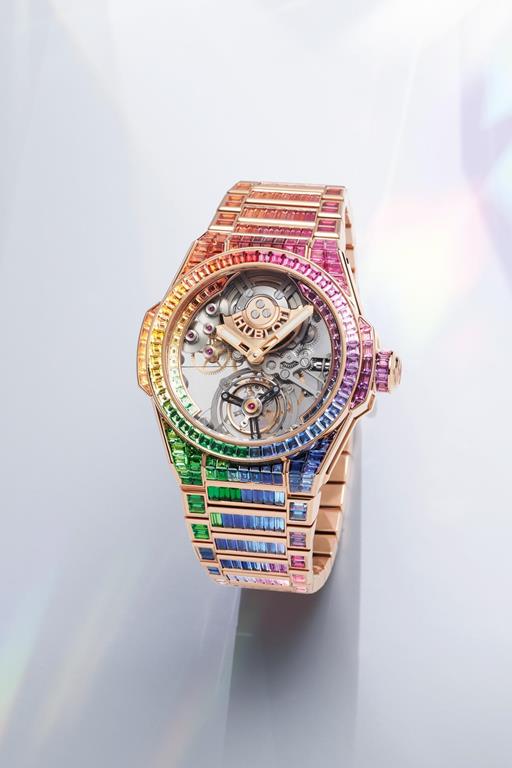 Predstavljata se dva izjemna kosa za merjenje časa, okrašena s celotnim mavričnim spektrom, ki prekriva vse od ohišja, številčnice do zapestnice. Big Bang Integral Tourbillon Rainbow je na voljo v različici iz rožnatega ali belega zlata, medtem ko safirno steklo razkrije fascinanten mehanizem tipa turbillon.