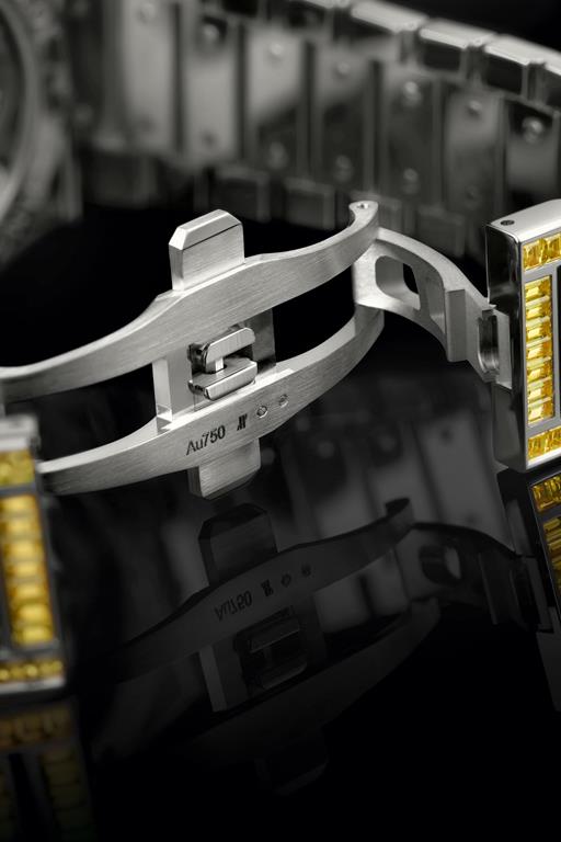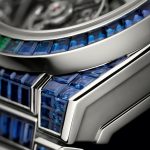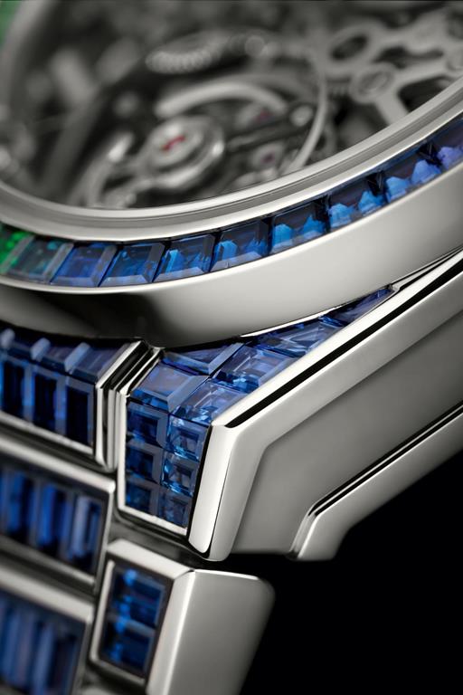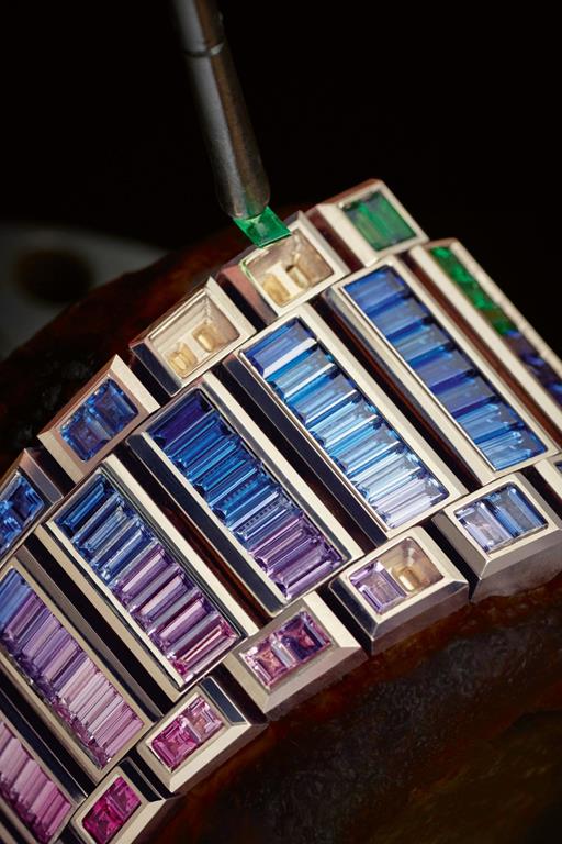 Na zapestni uri naštejemo skoraj 36 karatov, s 484 postavljenimi diamanti baguette reza v sedmih vrstah, ki odsevajo sedem vidnih barv spektra. V tem umetniškem delu ni nič prepuščeno naključju, vključno z mehanizmom, ki je v celoti zasnovan in izdelan interno.