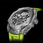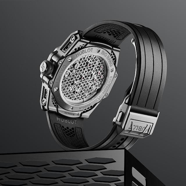 V skladu s splošno enobarvno estetiko je krona prevlečena s sivo gumo, medtem ko je mostiček tourbillona zdaj v nevtralnem odtenku. Za industrijski videz se je Ross odločil, da vse sestavne dele ohišja ure obleče v svetleč mikroplastiran titan, kar velja tudi za zaponko, ki ima grobo lasersko gravuro z logotipom Hublot.