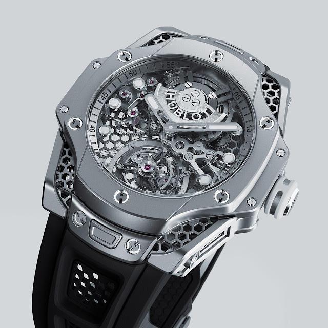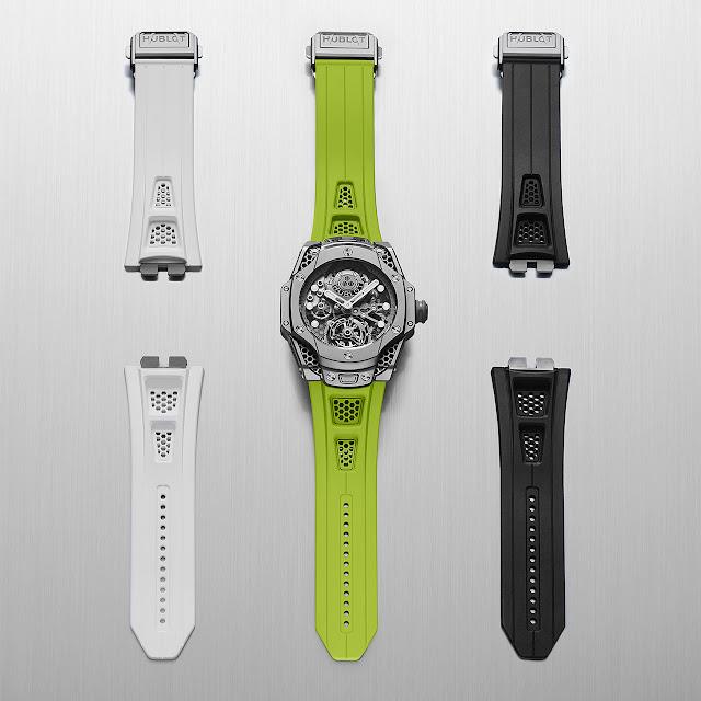 V skladu s splošno enobarvno estetiko je krona prevlečena s sivo gumo, medtem ko je mostiček tourbillona zdaj v nevtralnem odtenku. Za industrijski videz se je Ross odločil, da vse sestavne dele ohišja ure obleče v svetleč mikroplastiran titan, kar velja tudi za zaponko, ki ima grobo lasersko gravuro z logotipom Hublot.