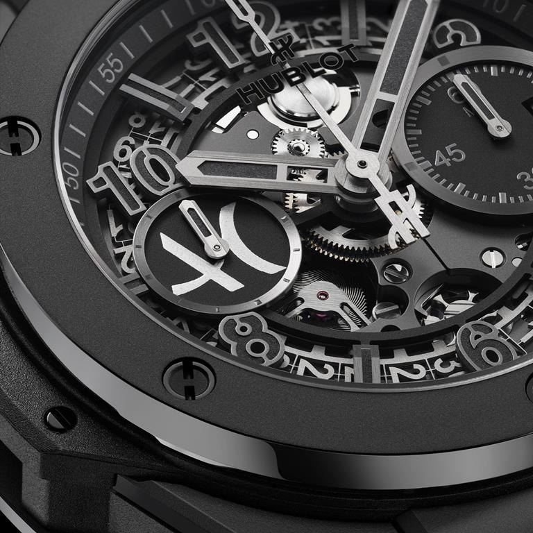 Kot že ime pove, je slavnostni Big Bang na voljo v popolnoma črnem dizajnu z 42 mm ohišjem iz mikro peskane keramike. Luneta je izdelana iz satiniranega črno prevlečenega titana s črnimi gumijastimi vstavki. Skupaj s satiniranimi in mikrobrušenimi gumbi kronografa iz črno prevlečenega titana doda globino celotnemu dizajnu. Mat črna odprta številčnica prikazuje logotip Andreasa Caminada na majhnem sekundnem registru, hkrati pa ponuja vpogled v zapleten kronografski mehanizem.
