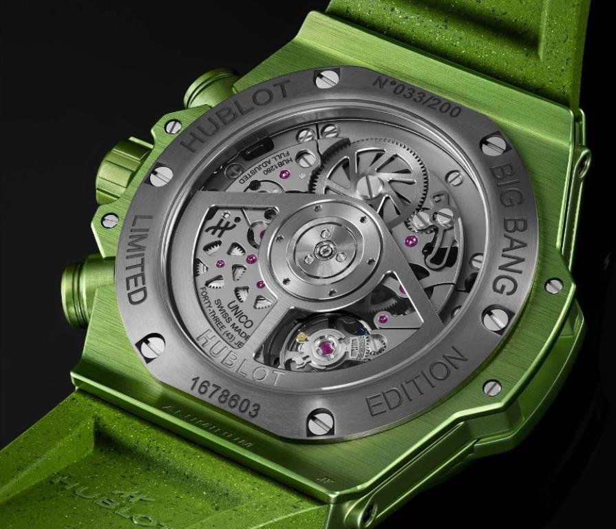 Big Bang poganja Hublotov avtomatski kronografski mehanizem, kaliber HUB1280 Unico. Kaliber Unico, ki je bil prvič predstavljen leta 2009, je eden redkih kronografskih mehanizmov, ki ima stebričasto kolo, nameščeno na strani številčnice, s čimer je njegovo zapletenost moč opazovati skozi zeleno skeletno številčnico.