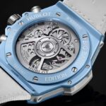 Posledično je razumljivo, da Hublot ponuja vsaj 100 m vodotesnosti v svetlo modrem Big Bangu Unico, s premerom keramičnega ohišja 42 mm in debelino 14,5 mm. DNK modela Big Bang Unico je prepoznaven s simetričnimi “ušesi” in okroglo luneto s 6 vijaki iz titana v obliki črke H. S stranskega pogleda lahko opazite sendvič konstrukcijo ohišja z belimi vstavki, ki služijo za blaženje udarcev, medtem ko so v skladu z brušeno površino lunete, krtačeni tudi veliki gumbi kronografa za mat športno privlačnost.