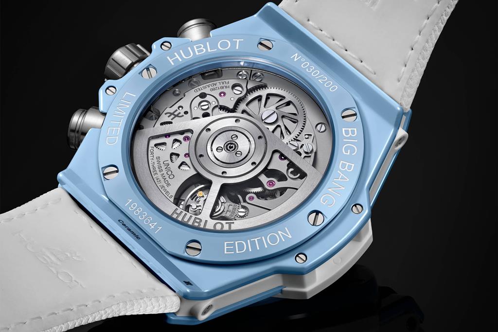 Ergonomsko ukrivljena zadnja stran ohišja razkriva Hublotov avtomatski kronografski mehanizem, kaliber HUB1280 Unico, ki deluje s frekvenco 4Hz oziroma 28.800 alternanc na uro, sestavlja ga 354-delov ter zagotavlja do 72 ur rezerve energije navitja.