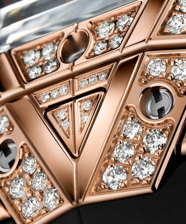 Ikonična in geometrijska estetika Sang Bleu je brezhibno prevedena na ohišje in luneto ure. Kljub svoji drzni in brezpolni zasnovi je ura premišljeno sestavljena s proporci, ki zagotavljajo ergonomsko in udobno prileganje na zapestja številnih velikosti. Zapletenost Büchijevega umetniškega jezika sega do zadnjega dela ohišja, kjer je mogoče skozi safirni kristal opazovati delovanje avtomatskega kronografskega mehanizma, kaliber HUB4700, katerega posebnost je skeletni navijalni rotor.