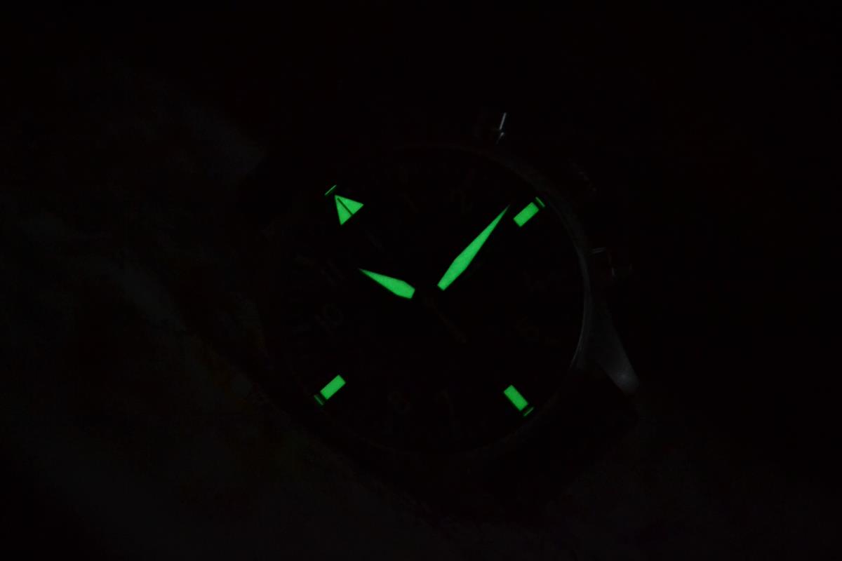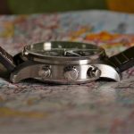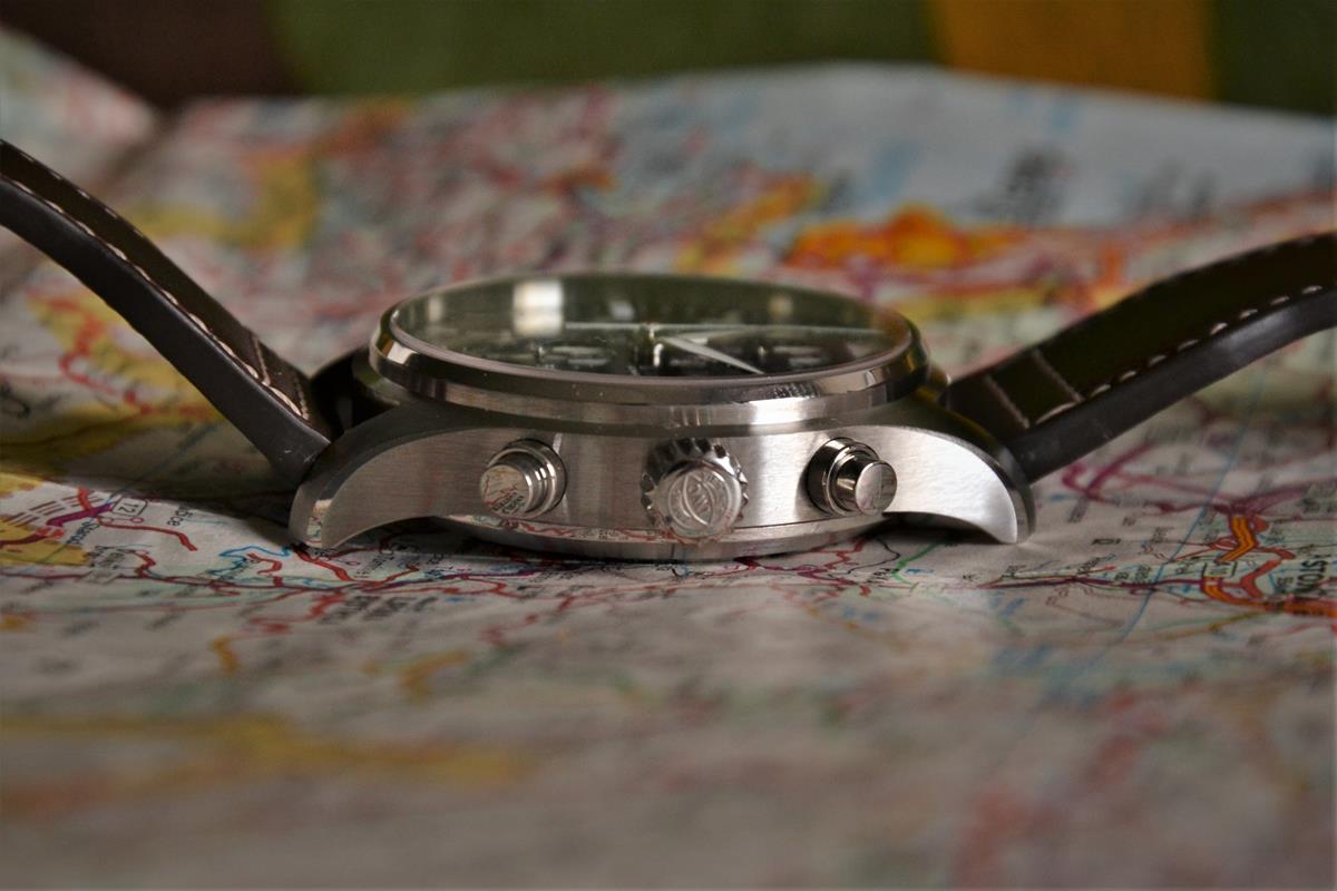Na desni strani brušenega ohišja s poliranimi robovi se zgoraj in spodaj nahajata gumba kronografa ter privijačena krona. Slednja poleg varnostne funkcije, doda nekaj metrov vodotesnosti na odmerjenih 60 metrov. A sklepam, da takšna ura ne bo videla kaj več od kaplje dežja.