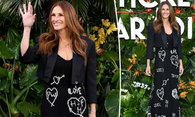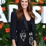 Med obiskom svetovne premiere filma ”Ticket to Paradise” v Londonu, je z Oskarjem nagrajena igralka nosila edinstveno obleko Alexandra McQueena z žigom kristaliziranih začetnic njenih treh otrok.
