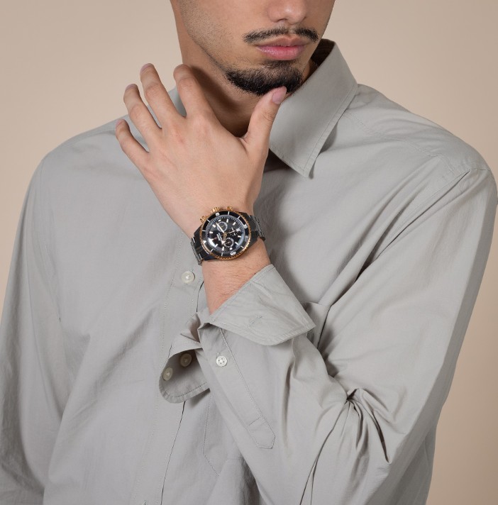 Na voljo sta dve izvedbe oziroma referenčne številke – Ena združuje mat črno keramično ohišje z luneto, krono in gumbi kronografa iz nerjavečega jekla, prevlečenega z rožnatim zlatom PVD. Uporabljeni urni kazalci in polirani kazalci so prav tako v barvi rožnatega zlata s svetlečim polnilom.