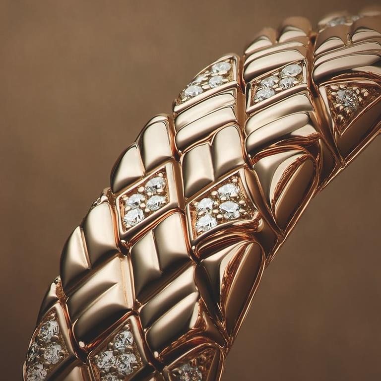 Ura Serpenti Spiga odseva pšenični vzorec, ki simbolizira plodnost in blaginjo. Moduli zapestnice so izdelani individualno, da se ohrani celovitost dizajna. Tako se lahko vsaka povezava ponovi in s tem tvori poseben vzorec.