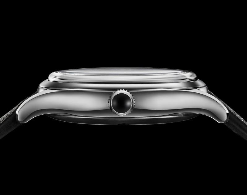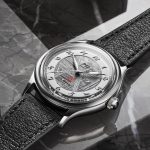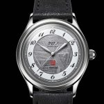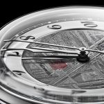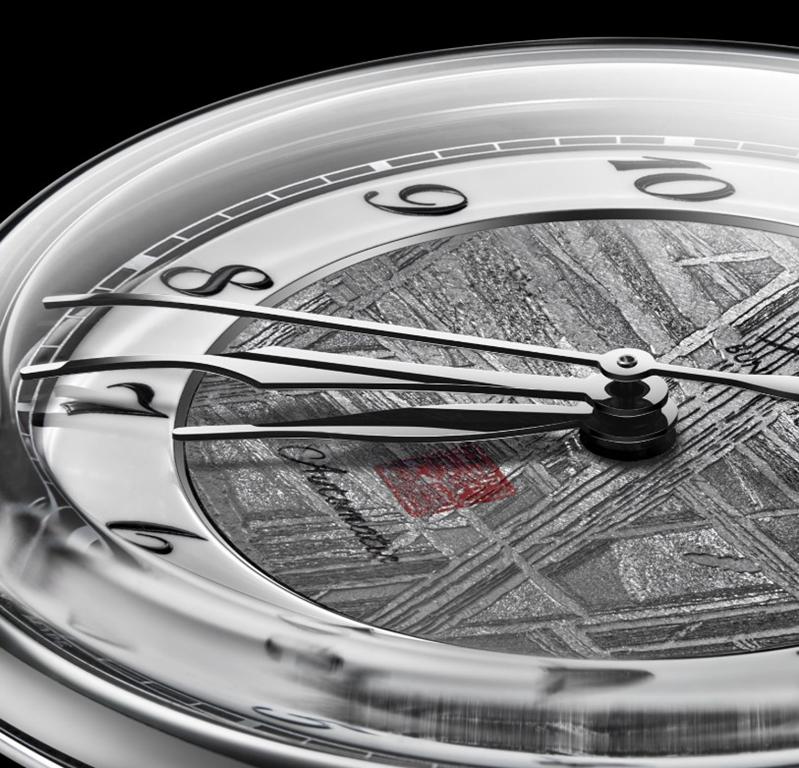 Safirno steklo ščiti ta unikatni kos, medtem ko hrbtna stran razkriva avtomatski mehanizem kaliber 90S5, dobavljen s strani Miyote, ki deluje pri 4 Hz in nudi do 40 ur rezerve energije navitja. Na stilski številčnici sivo-črna struktura meteorita ustvarja naraven vzorec, ki se spreminja glede na svetlobo. Ohišje je opasano s črnim usnjenim paščkom.