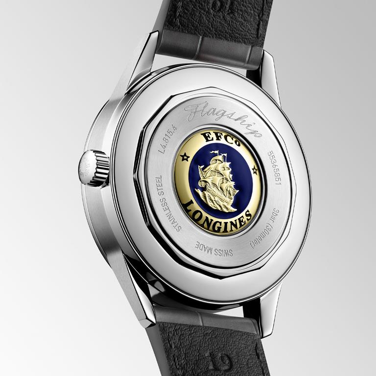 Hrbtno stran ohišja je zatesnjena s pokrovom iz nerjavečega jekla, na katerem se nahaja lep vložek iz rumenega zlata z reliefno podobo ladje na valovih na modri podlagi – emblem kolekcije Flagship. Davek gravure je onemogočen pogled na delovanje avtomatskega mehanizma, kaliber L899.5, bije s 25.200 alternancami na uro in zagotavlja do 72 ur rezerve energije navitja.