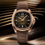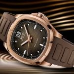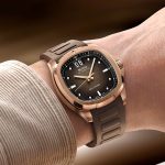 Novo jekleno ohišje PVD iz rožnatega zlata z navpično brušenim okvirjem in poliranimi poševnimi robovi znatno dvigne luksuzni faktor ure. V kombinaciji s teksturirano čokoladno rjavo številčnico si deli videz – ne pa tudi cene – s Patek Philippe Aquanautom. Zaključki ohišja so presenetljivo dovršeni za cenovno “dostopno” športno uro, podrobnosti, kot so “ustnice” na obeh koncih okvirja in vdolbina, peskana pika ob poldnevu, poudarjajo skrb, ki je bila vložena v dizajn.