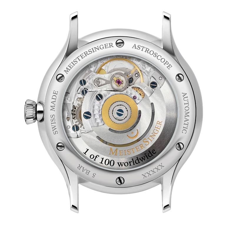 Model Astroscope potrebuje kratko predstavitev, da bi resnično razumeli celoten koncept. Kar je enostavno razumeti, je postavitev osrednjega kazalca v stilu MeisterSinger, ki prikazuje čas. Ta z eno rotacijo okoli številčnice v 12 urah prikazuje čas na najbližjih 5 minut, kar vas bo naučilo živeti nekoliko počasneje, z nekoliko drugačno filozofijo. Preostali del številčnice, s kombinacijo pik in nebesnih teles, natisnjenih v beli barvi, je pravzaprav precej poseben način za prikaz preprostega zapleta – dneva v tednu … Toda MeisterSinger raje dela stvari po svoje.