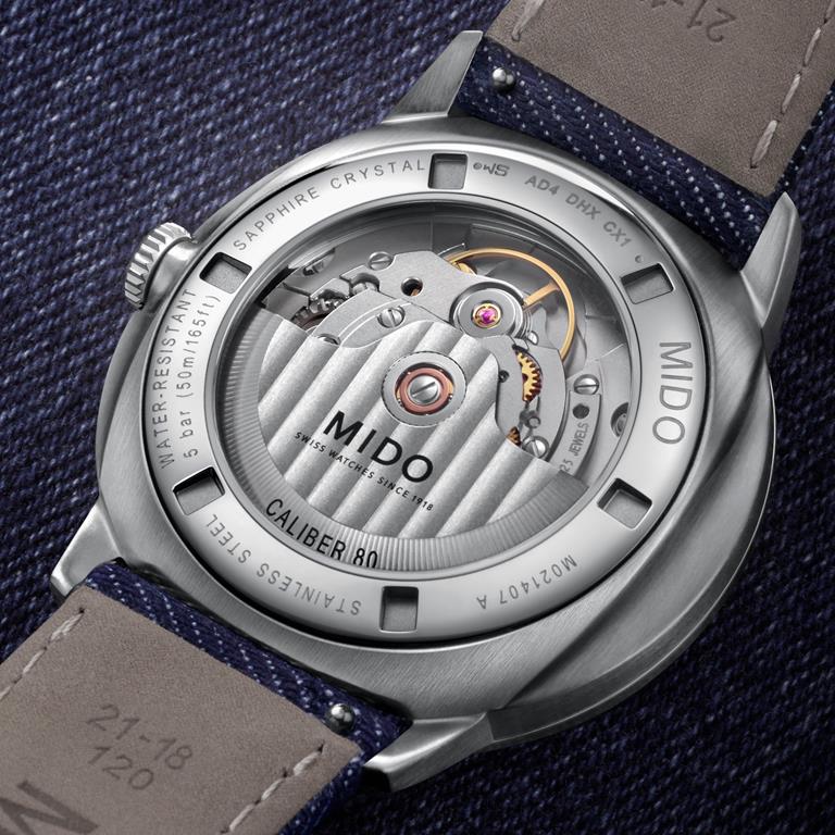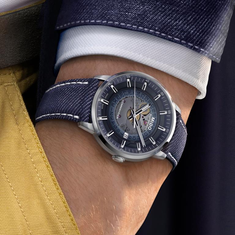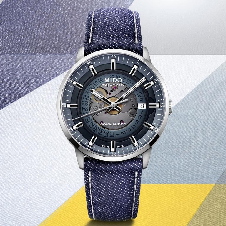 Mido je pred tremi leti sledil najnovejšim trendom v urarstvu, in tako razkril mehanizem pod številčnico modela Commander. Letošnje poletje se linija ponovno predstavlja z referenco s hladno modro gradientno številčnico ter paščkom iz džinsa.