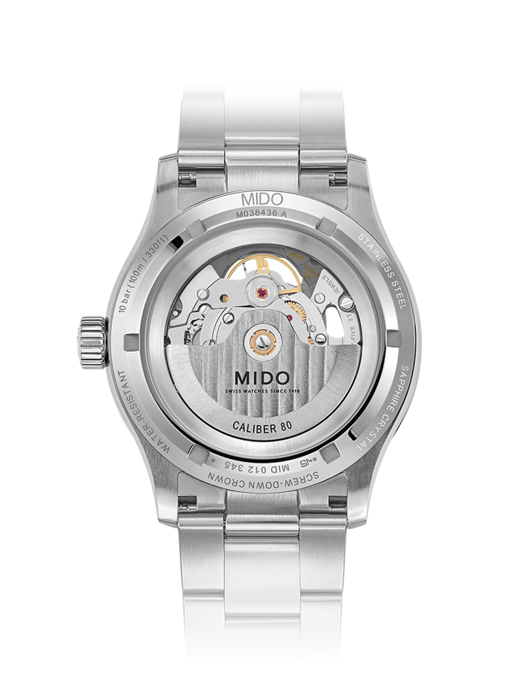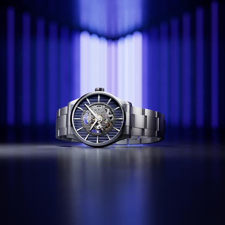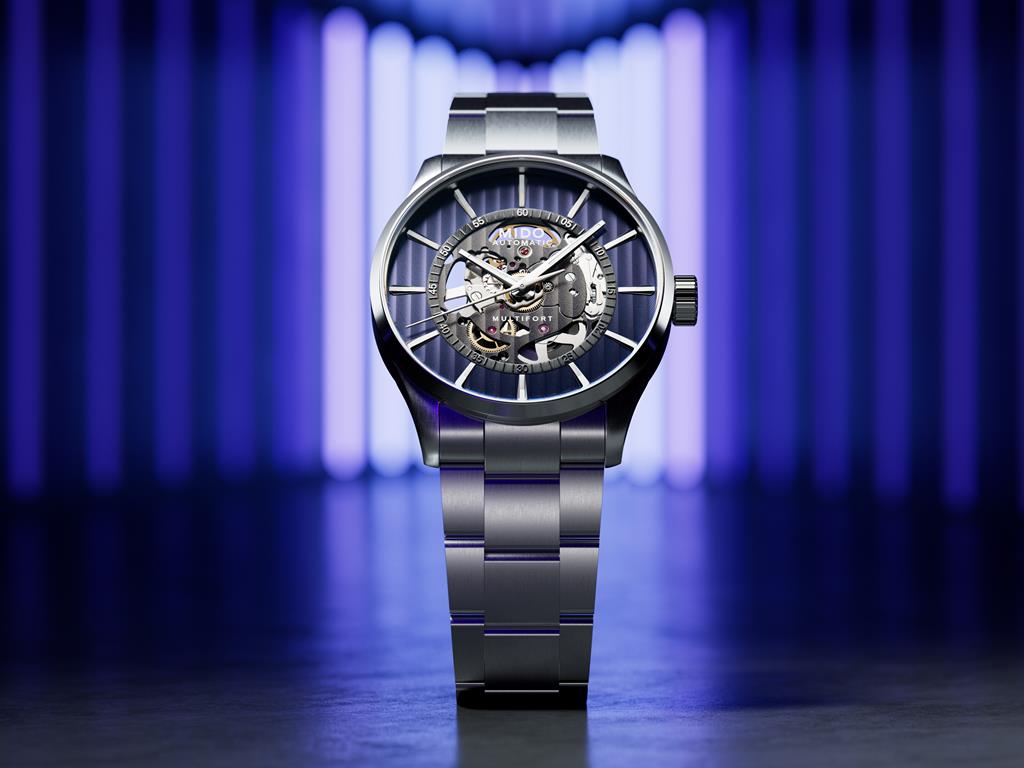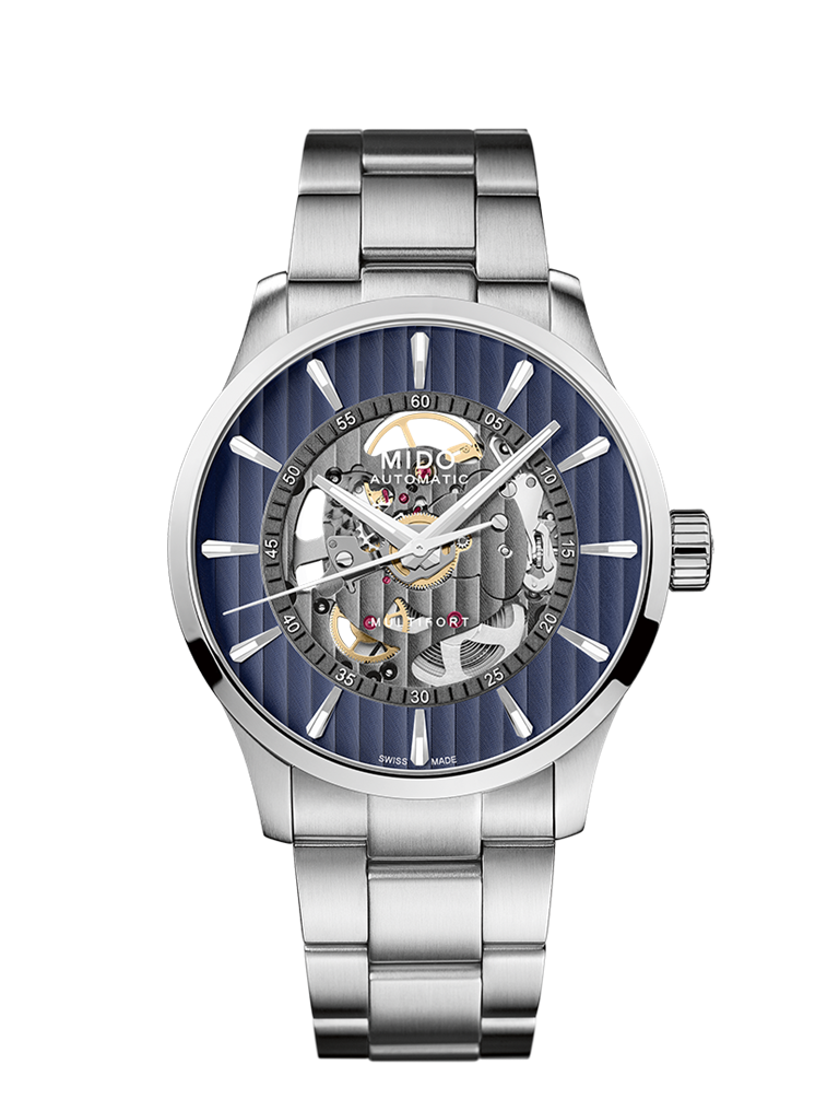 Multifort Skeleton Vertigo Blue je presenetljiv in fascinanten: njegove ženevske črte potekajo po zunanjem obroču in na osrednjo mesto številčnice, kar ustvarja optično iluzijo, v kateri se pojavi mehanizem. Tehnično in izjemno odporno to uro poganja mogočni kaliber 80. Mido je ta model opremil tudi z visokotehnološko antimagnetno uravnoteženo vzmetjo Nivachron. Fantastična prednost v smislu njegove zanesljivosti, s prednostjo izjemne moči, je še rezerva energije navitja do 80 ur.