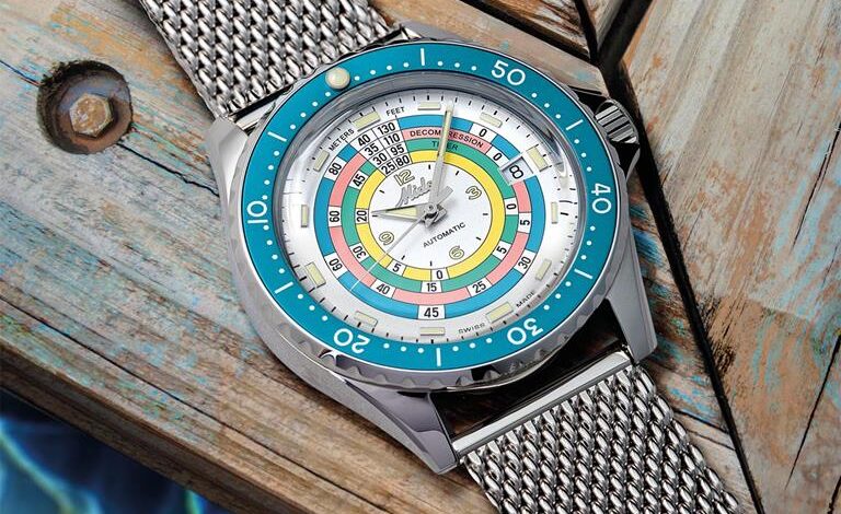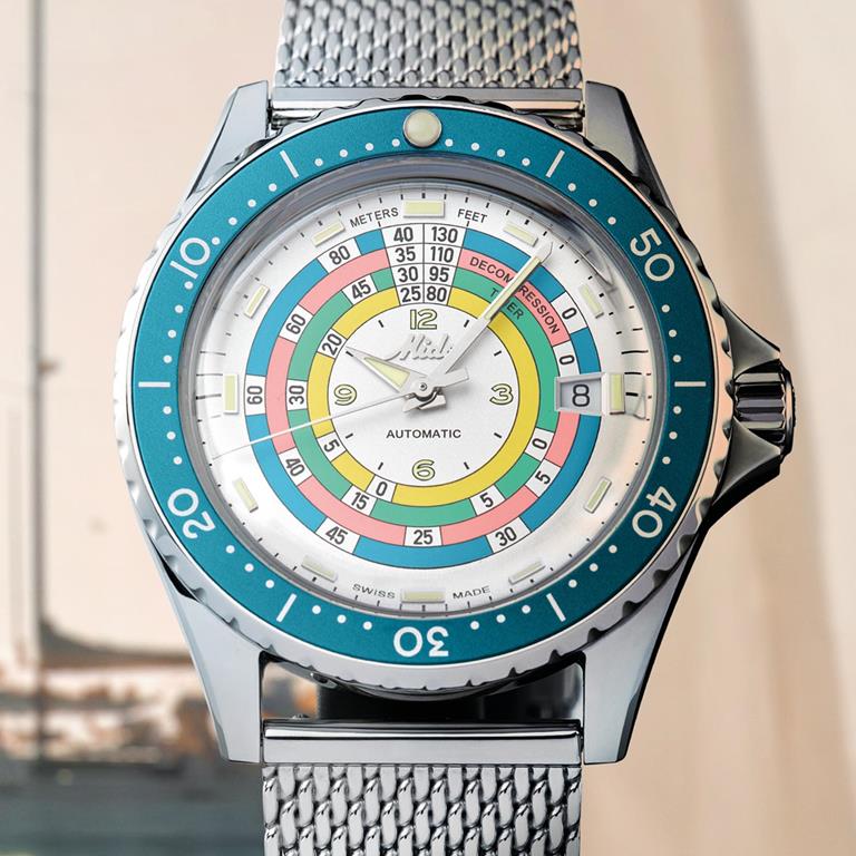 Mavrična ura izhaja iz Midovega potapljaškega modela, predstavljenega v 60. letih prejšnjega stoletja, ki si je med potapljači ter zbiralci ur izborila kultni status. Mido Ocean Star Decompression Timer za leto 2021 se ponaša s harmonično številčnico. V teh barvah se skrivajo skale, s pomočjo katerih potapljač opravi kalkulacijo dekompresije.