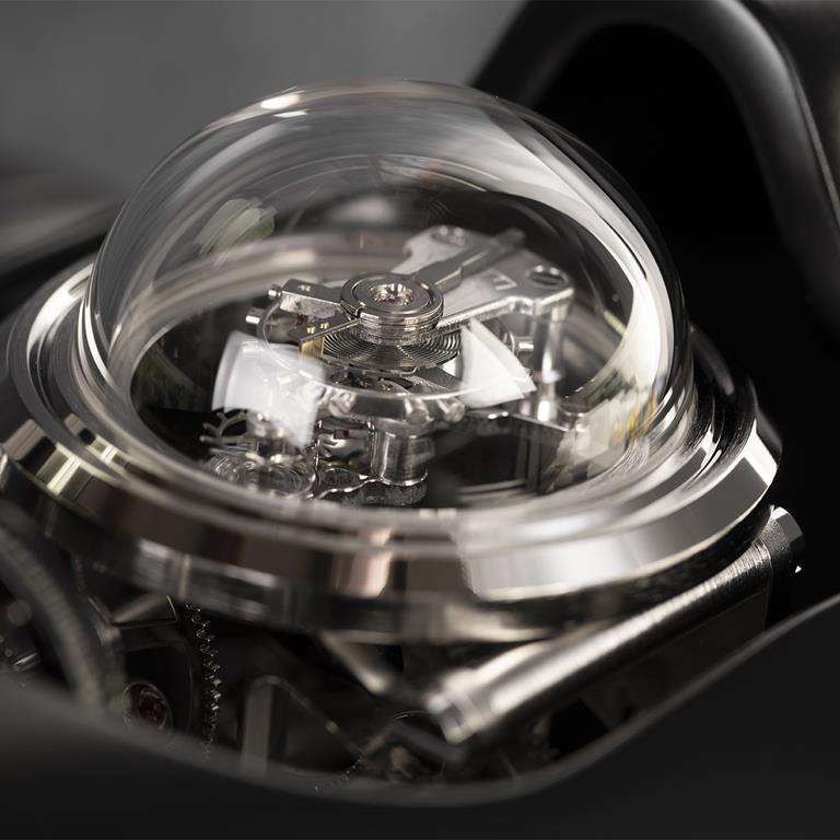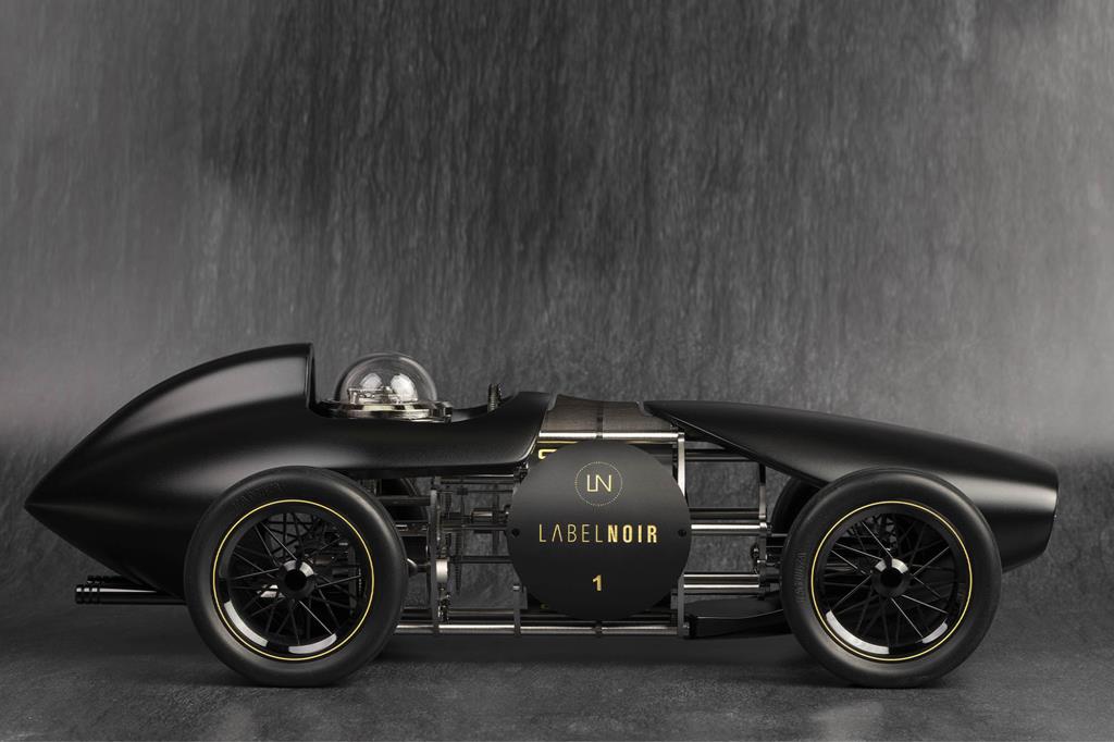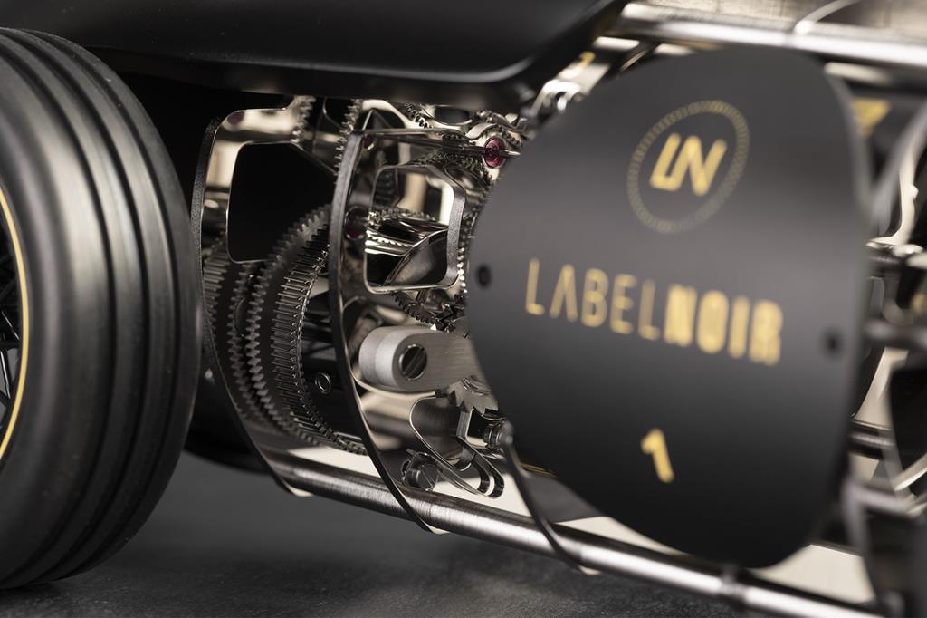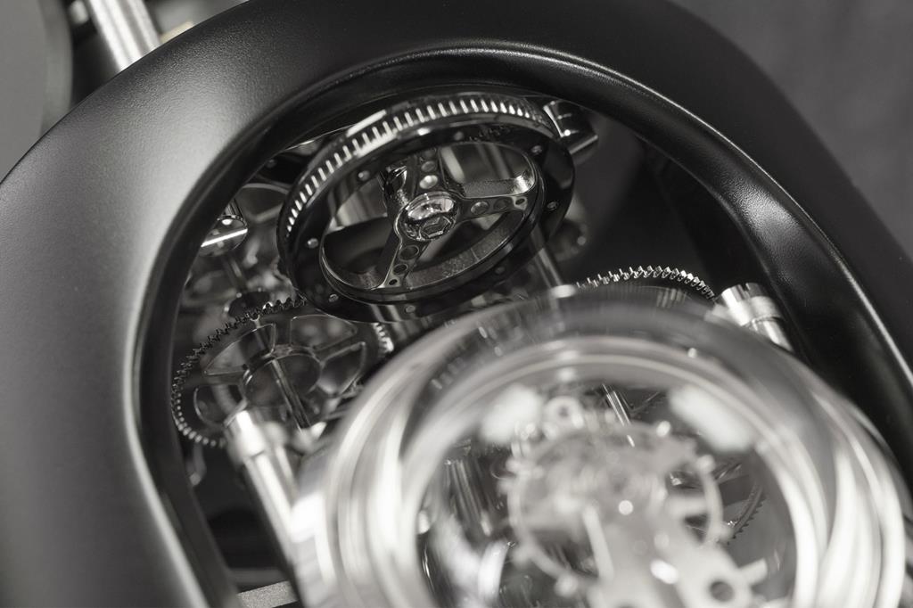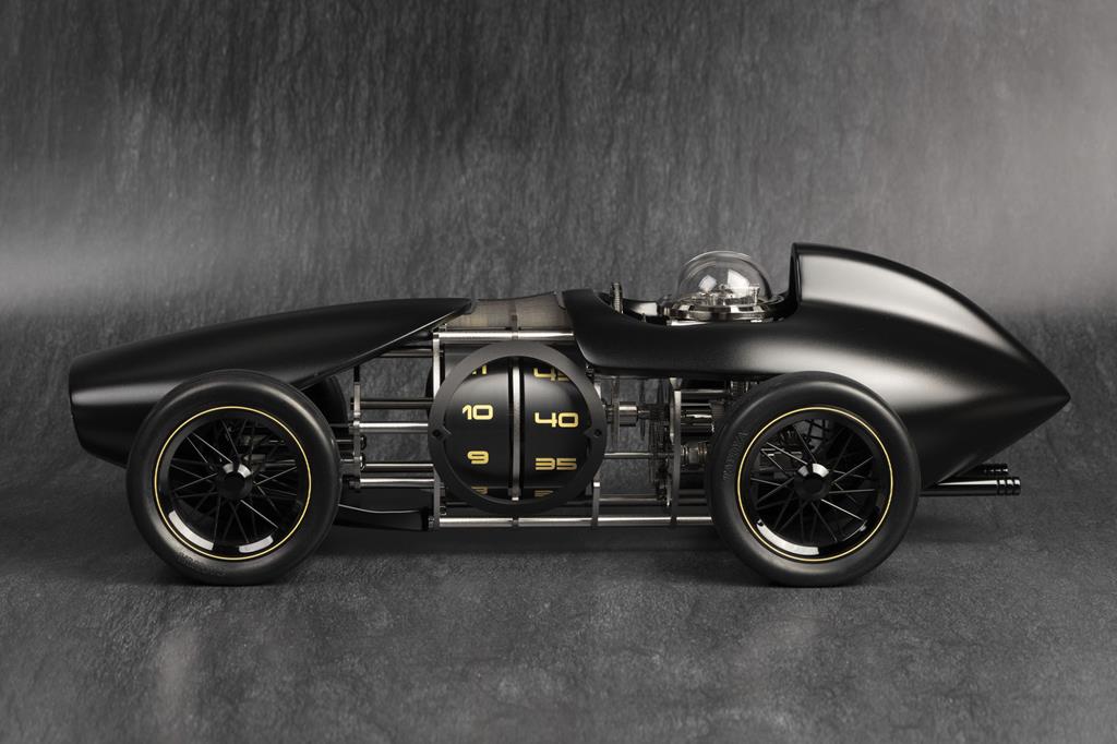 Namizna ura v duhu starih dirkalnih vozil s štirimi kolesi, motorjem, kokpitom ter črno mat karoserijo bo le malo katerega avtomobilskega navdušenca pustila hladnega, saj gre za izvrstno mehansko interpretacijo dveh zgodovinsko vzporednih svetov – urarstvo in avtomobilizem.