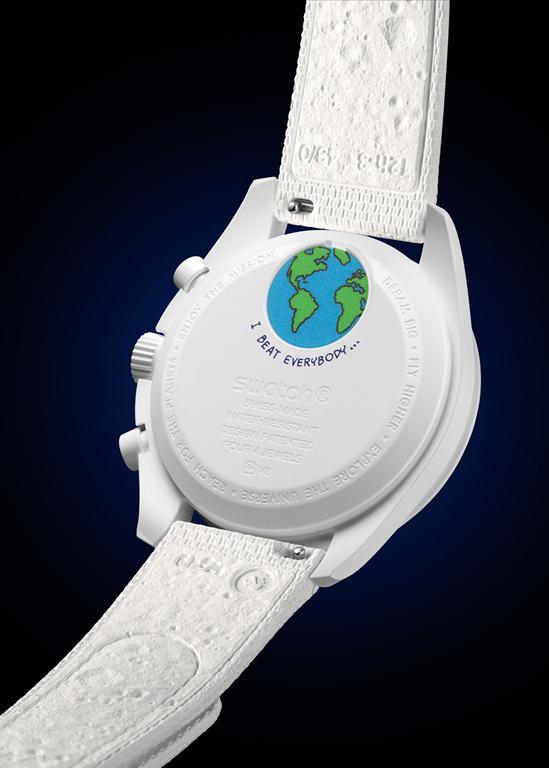 Indikatorji ur in kazalci so prevlečeni z zeleno svetlečo Super-LumiNova. UV svetloba razkrije »skrivni« stavek poleg slike Snoopyja in Woodstocka, ki se glasi: »I beat everybody…« Na zadnji strani ohišja, pod pokrovčkom baterije, najdemo ta stavek še enkrat, tokrat v modri barvi. MoonSwatch Mission to Earthphase Moonshine Gold je opremljen z belim gumijastim paščkom z belo biokeramično zaponko.