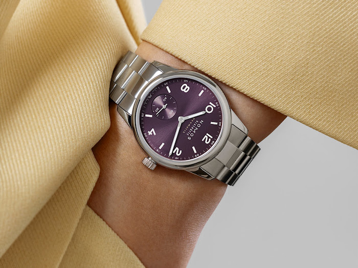 Club Sport neomatik 34 je spojen z zapestnico iz satenasto brušenega in poliranega jekla s tremi členi, ki je na zapestje pritrjena z varnostno zaponko. Predlagane maloprodajne cene ur nove kolekcije Nomos Glashutte Club Sport neomatik 34 z zlato (ref. št. 755), rožnato (ref. št. 756) ali vijolično (ref. št. 757) številčnico znašajo 2.780 evrov.