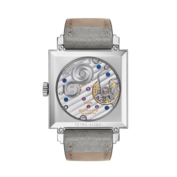 Na hrbtni strani Tetre je v kvadratnem ohišju okroglo okno s pogledom na mehanizem Nomos Caliber Alpha. Mehanizem shrani 43-ur rezerve moči in ima značilno Nomosovo dodelavo, z elementi, ki vključujejo kaljene modre vijake, površine prevlečene z rodijem, rebrasto graviranje Glashütte in vzorec sončnega vzhoda na raglji in kronskem kolesu.