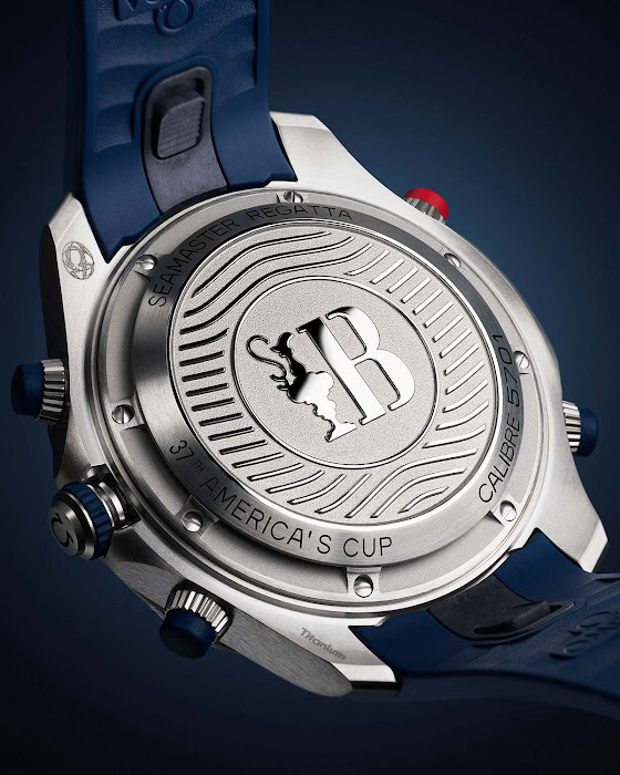 Na tej dvignjeni hrbtni strani je vtisnjen prepoznavni logotip 37. pokala Amerike ter gravirani napisi „SEAMASTER REGATTA“ in „37th AMERICA’S CUP“.