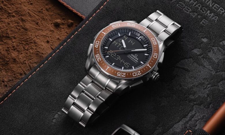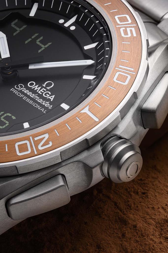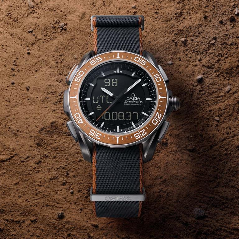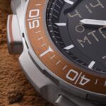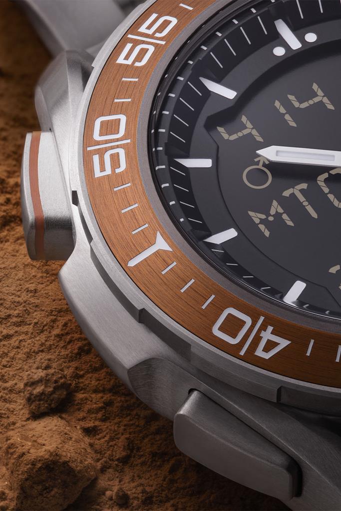 Seveda pa so snovalci poskrbeli, da ura opravlja naloge v stilu, torej, s prepoznavno oblikovno identiteto blagovne znamke Omega. Klasična črna številčnica zagotavlja kontrastno ozadje za več analognih in digitalnih odčitkov, ki so še dodatno pojasnjeni s simboloma Zemlje in Marsa, da lahko ločite, katere funkcije so trenutno v uporabi. Okoli številčnice se nahaja oksalno eloksirana aluminijasta luneta v rdeči hematit barvi, ki spominja na Marsov značilen prah. Ta osupljiv odtenek je prisoten tudi na barvno prelivajočem sekundnem kazalcu.