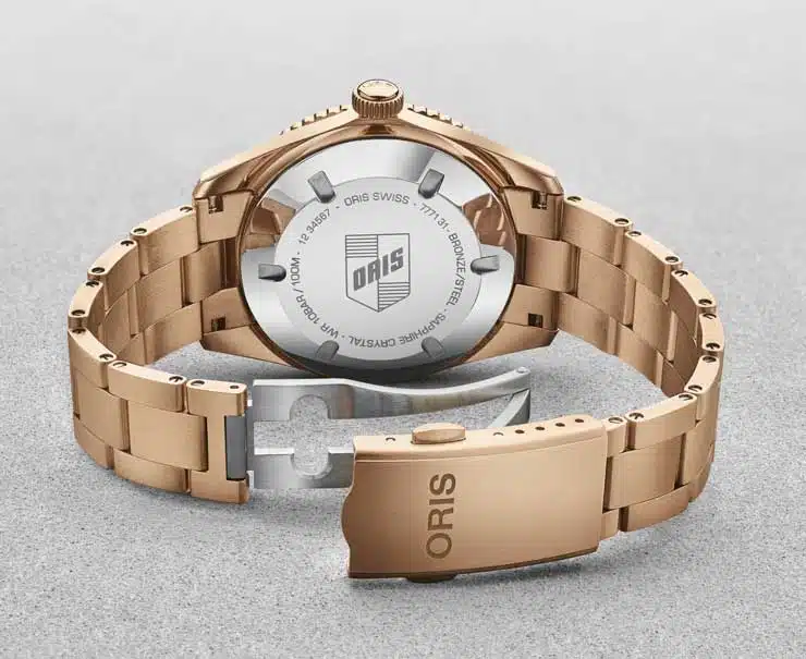 Bronasta barva reagira z ogljikovim dioksidom in vlago ter sčasoma dobi edinstveno zelenkasto patino, kar pomeni, da boste imeli unikat, saj se dve bronasti uri ne starata na enak način. 38-milimetrsko bronasto ohišje ima nazobčano enosmerno vrtljivo bronasto reliefno luneto s 60-minutno skalo. Za preprečevanje kožnih alergij je privita hrbtna stran ohišja izdelana iz nerjavečega jekla in skupaj z bronasto krono, ki se privija, zagotavlja 100-metrsko vodotesnost.