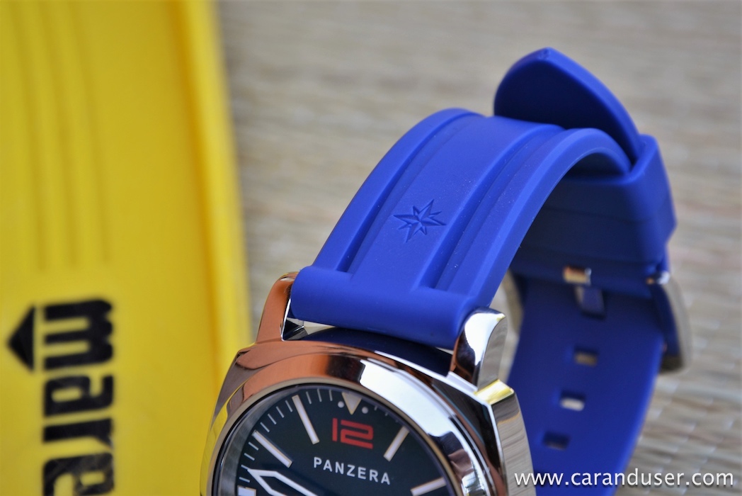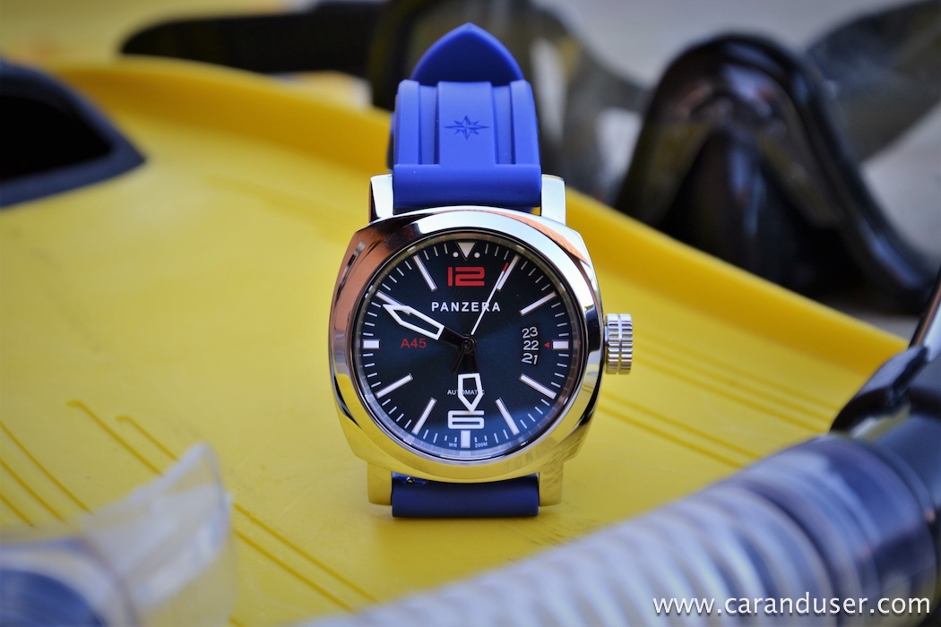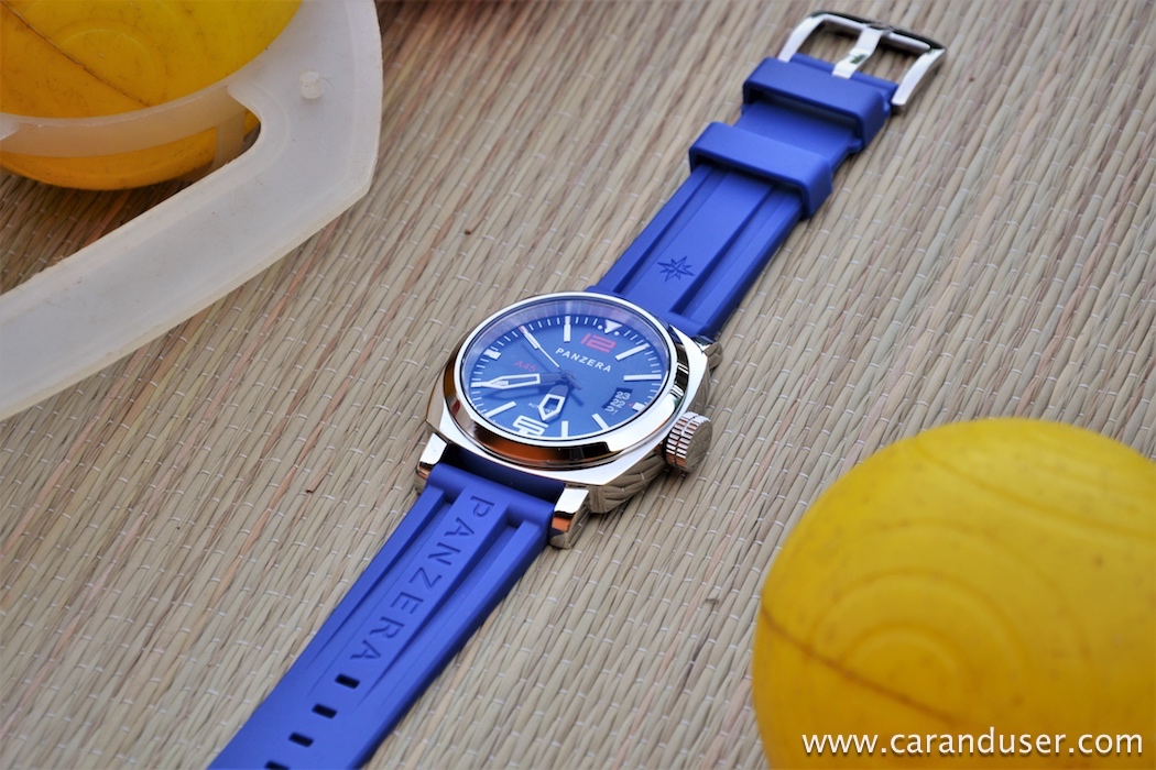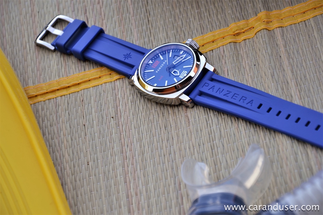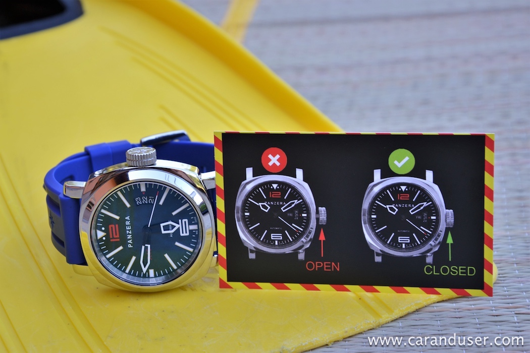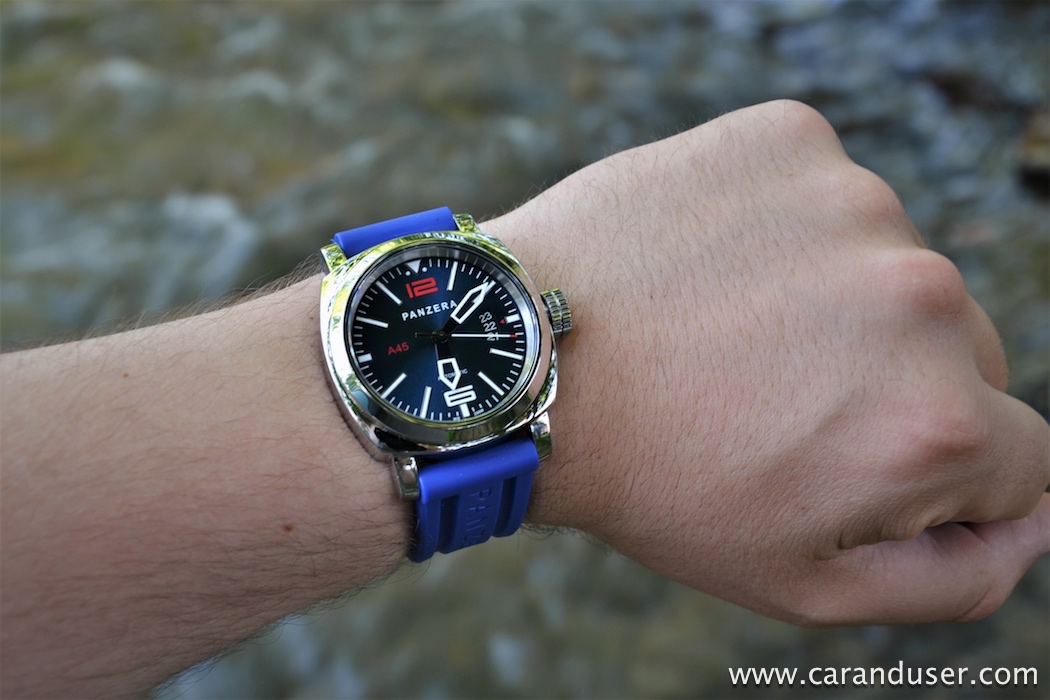 Potapljaški uri tudi sam nimam kaj očitati, saj dobro sede na moje zapestje, ki v obseg meri 20 centimetrov, zato posledično lahko na manjših zapestjih (manj od 16 centimetrov) precej hitro deluje kot stenska ura. Visoko polirano kovinsko ohišje v premer meri 45 milimetrov, medtem ko razdalja od ušesa do ušesa znaša 55 milimetrov. K impozantnosti pripomore še debelina ohišja s 13 milimetri, 24 milimetrska širina paščka ter velika privijačena krona na desni strani ohišja z napisom ter logotipom Panzera.