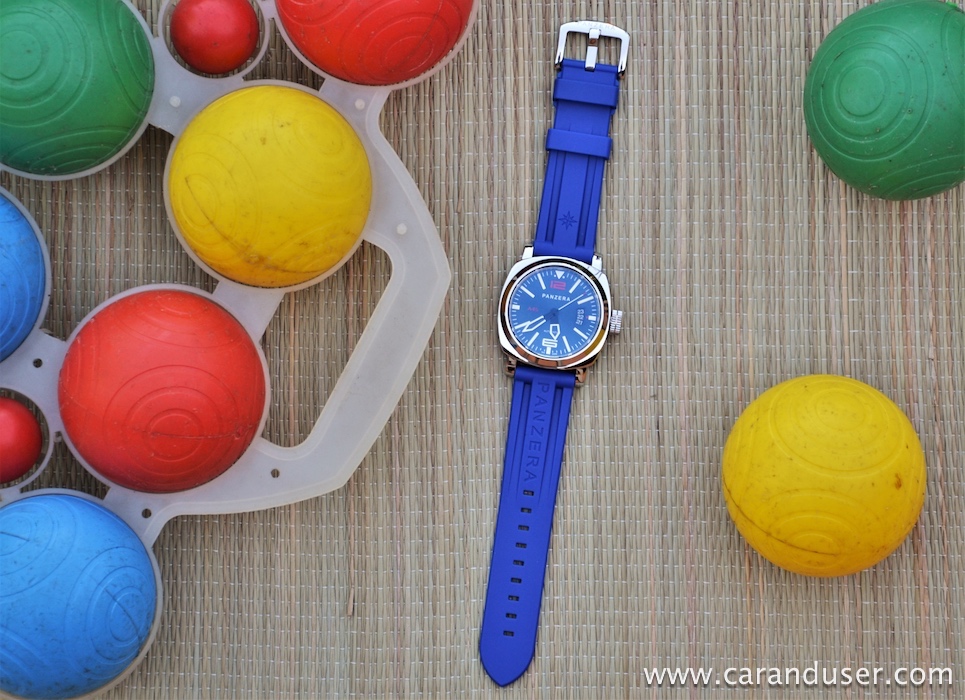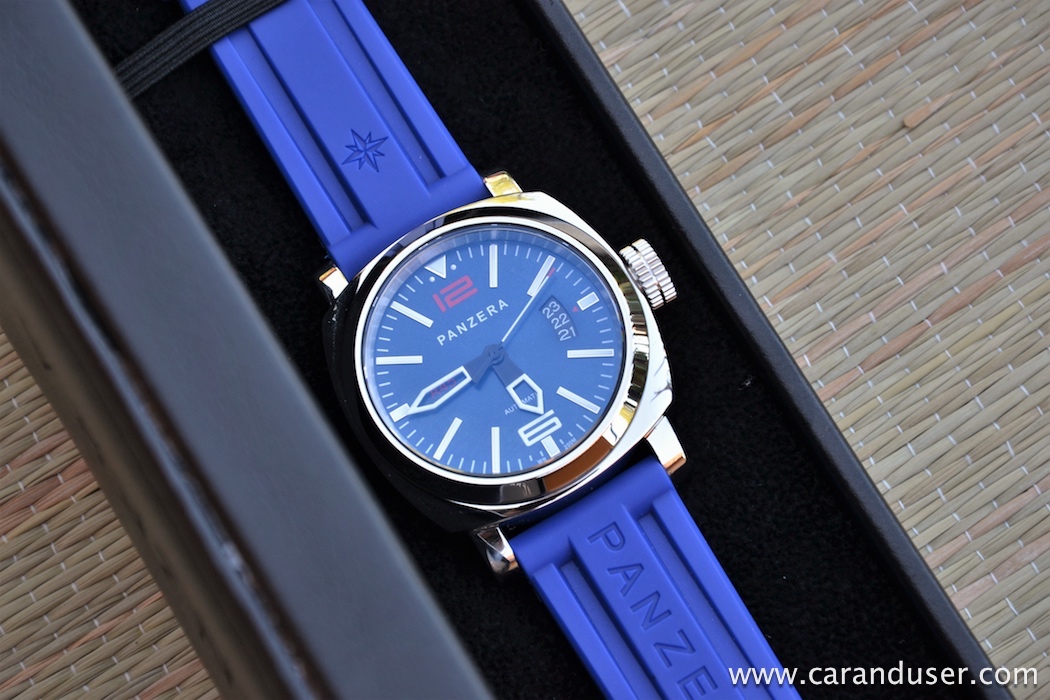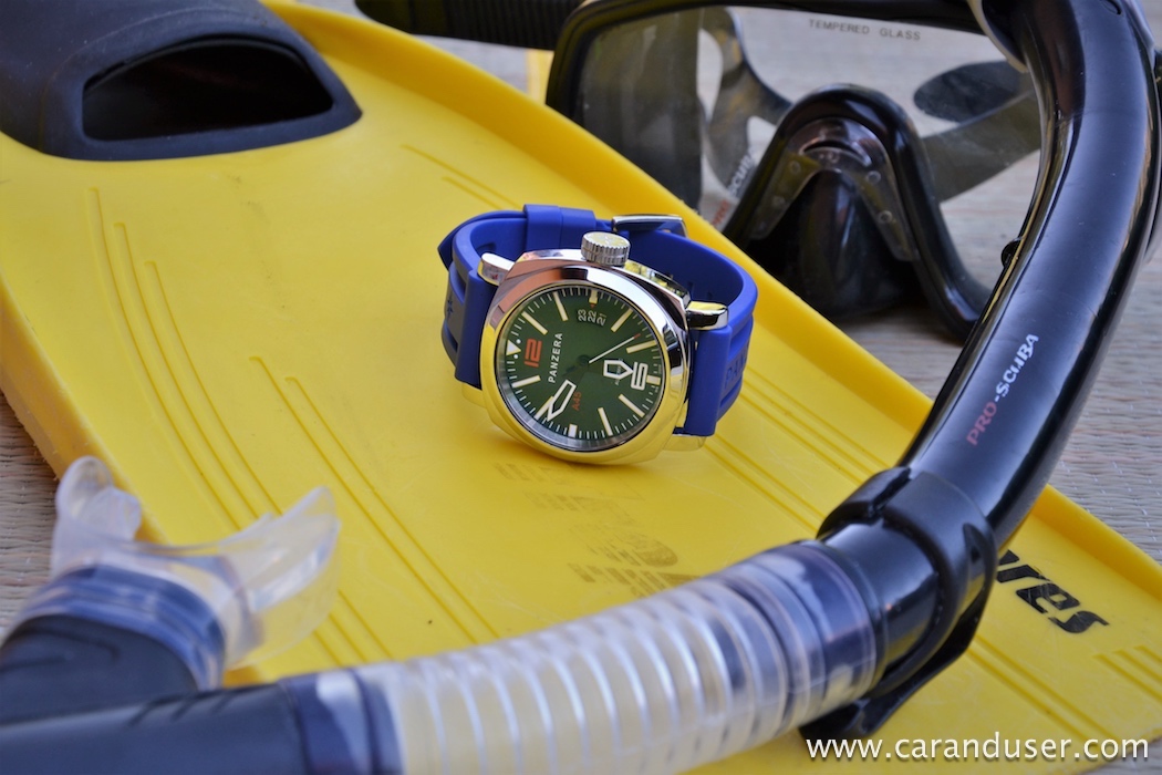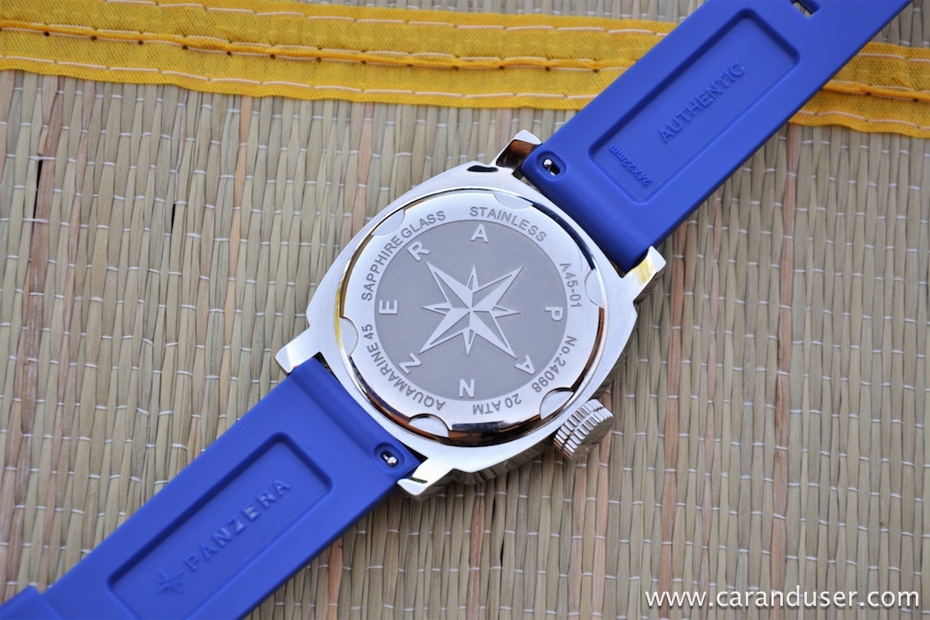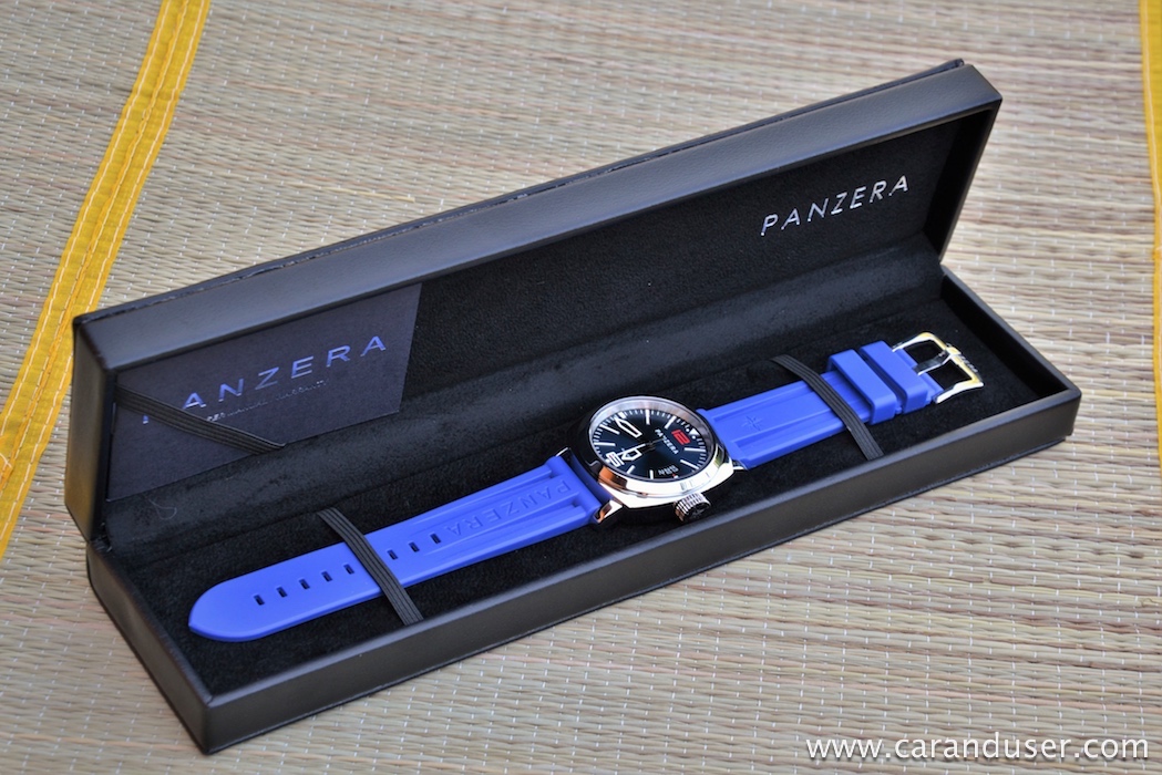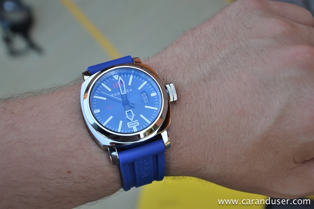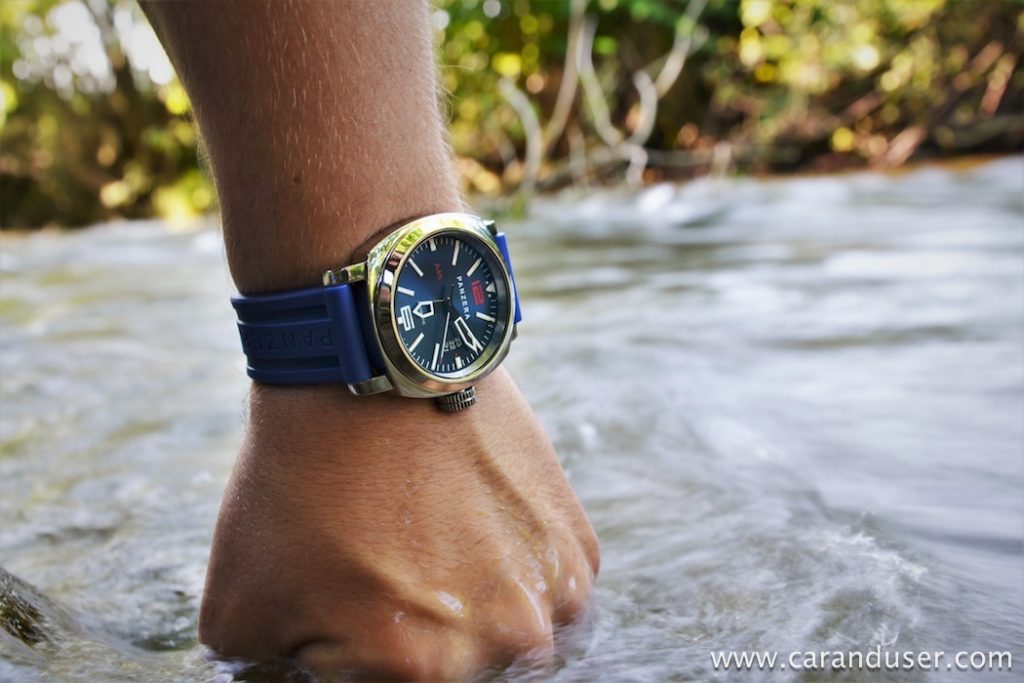 Potapljaški uri tudi sam nimam kaj očitati, saj dobro sede na moje zapestje, ki v obseg meri 20 centimetrov, zato posledično lahko na manjših zapestjih (manj od 16 centimetrov) precej hitro deluje kot stenska ura. Visoko polirano kovinsko ohišje v premer meri 45 milimetrov, medtem ko razdalja od ušesa do ušesa znaša 55 milimetrov. K impozantnosti pripomore še debelina ohišja s 13 milimetri, 24 milimetrska širina paščka ter velika privijačena krona na desni strani ohišja z napisom ter logotipom Panzera.