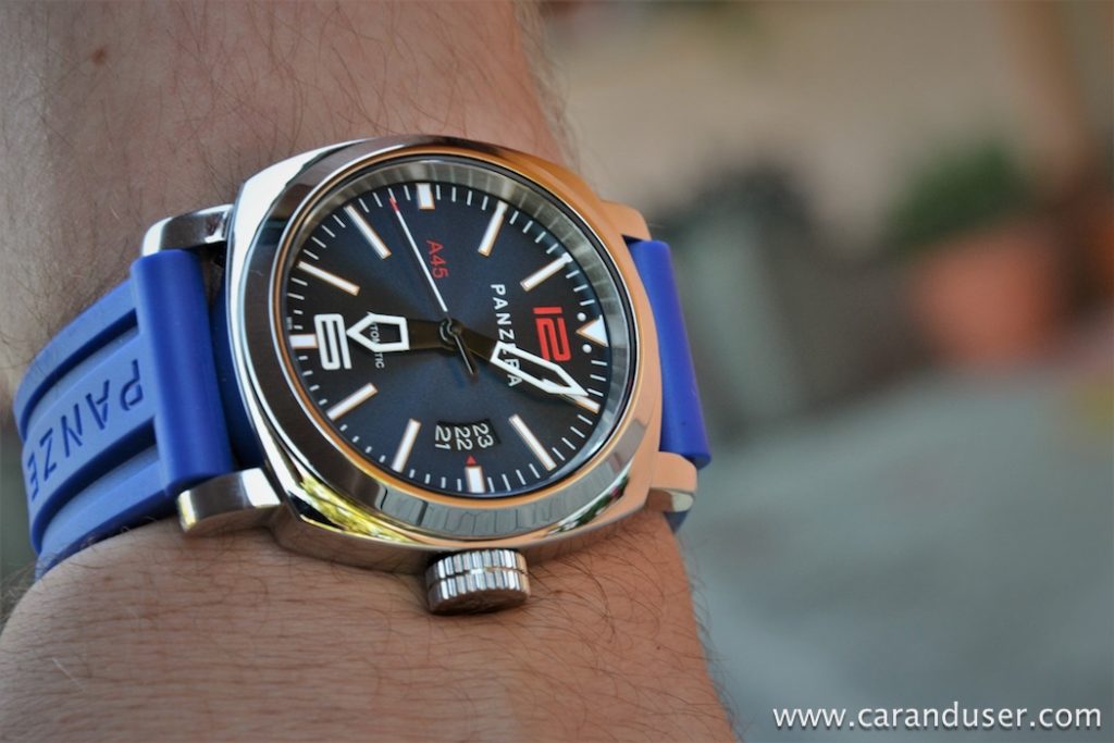 Potapljaški uri tudi sam nimam kaj očitati, saj dobro sede na moje zapestje, ki v obseg meri 20 centimetrov, zato posledično lahko na manjših zapestjih (manj od 16 centimetrov) precej hitro deluje kot stenska ura. Visoko polirano kovinsko ohišje v premer meri 45 milimetrov, medtem ko razdalja od ušesa do ušesa znaša 55 milimetrov. K impozantnosti pripomore še debelina ohišja s 13 milimetri, 24 milimetrska širina paščka ter velika privijačena krona na desni strani ohišja z napisom ter logotipom Panzera.