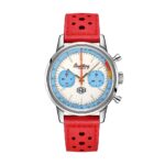 Še par besed o uri Breitling x Deus Ex Machina Top Time. Ima 41-milimetrsko ohišje iz nerjavečega jekla, v sredini katerega je številčnica z ”bi-compax” postavitvijo kvadratnih podštevilčnic. Svežino časomeru prinašajo edinstvene poteze znamke Deus Ex Machina, kot so sekundni kazalec kronografa v obliki strele, gobasta gumba kronografa in gravura avstralskega podjetja na hrbtni strani ohišja.